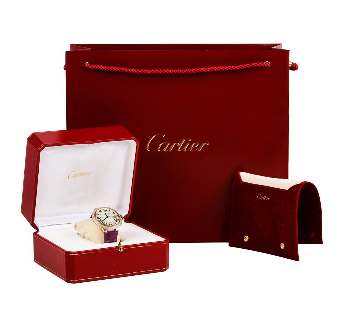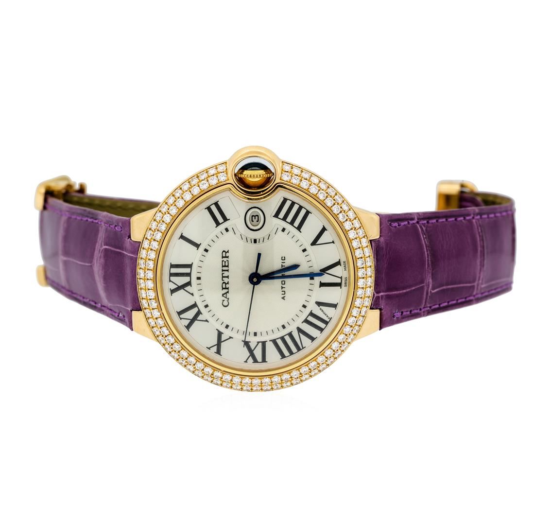 One, Ballon Bleu de Cartier wristwatch electronically tested 18KT yellow gold, Case: 42mm diameter, Water Resistant: 30 meters / 100 feet, Swiss & Cartier Hallmarked Case Back: Convex, secured by eight inset screws, Fluted Crown: set with a blue cabochon crystal, within a protective casing, Custom Bezel: two tiered diamond set, Crystal: anti-reflective domed synthetic sapphire.Movement: automatic, Dial: Silvered, with sword shaped Blue steel hands & Roman numerals, central circular minute track with bolded five minute intervals, Date Window: 3 o'clock position, AVG Bracelet: Purple color saddle stitched leather strap, Condition: G-5 Fine. Seven inch length, adjustable. 18KT gold Swiss & Cartier Hallmarked concealed deployment clasp. Containing:Numerous pave� & prong set round brilliant cut diamonds, approximate total weight = 2.00ct. Set & graded in the bezel. Clarity: VVS-2 Color E - F. Total Weight of Diamonds 2.00ct. Total Weight of Watch 108.57gm. AIG Appraised at $44,000.00.