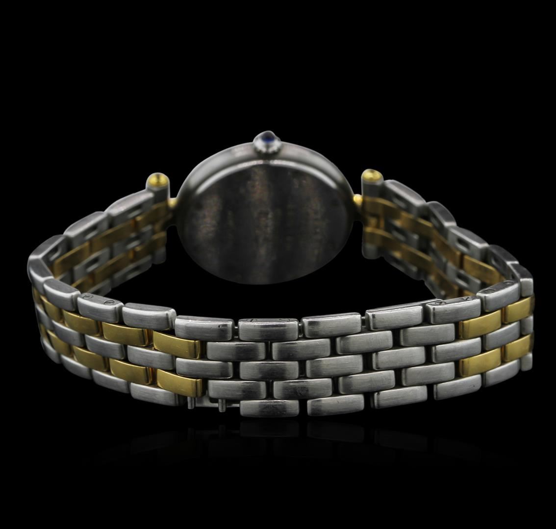 Cartier Panthere Vendome date ladies watch. The watch has an 18KT yellow gold bezel and 18KT yellow gold links on the band. White dial. Stainless steel 29mm case. 18KT yellow gold and stainless steel 6 inch band. Stainless steel hidden folding clasp. Sapphire crystal glass. Quartz: Battery movement.