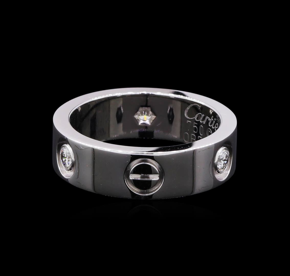 One Cartier Love ring featuring 18KT white gold containing three diamonds. The ring is stamped Cartier. Size 6. Comes with red Cartier pouch.