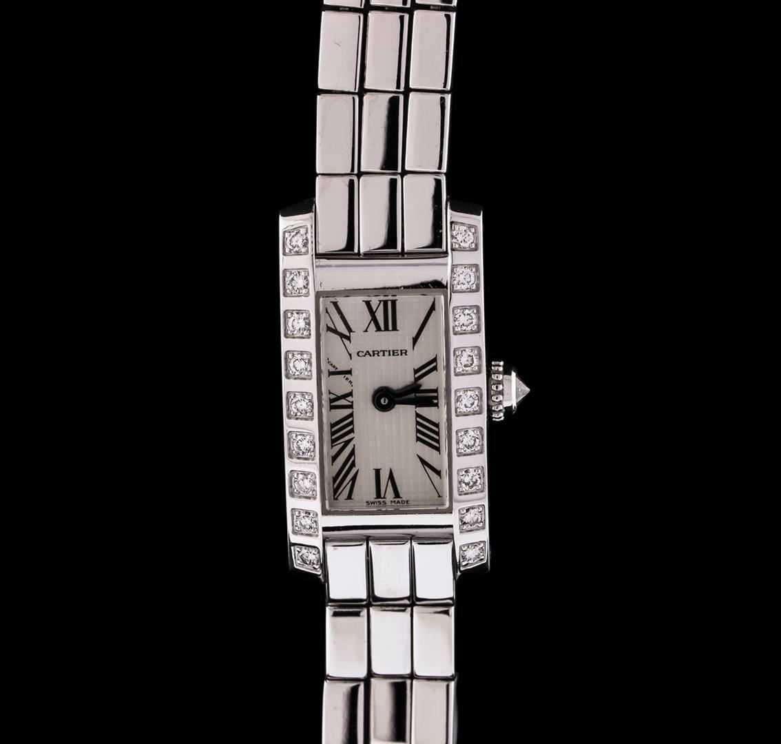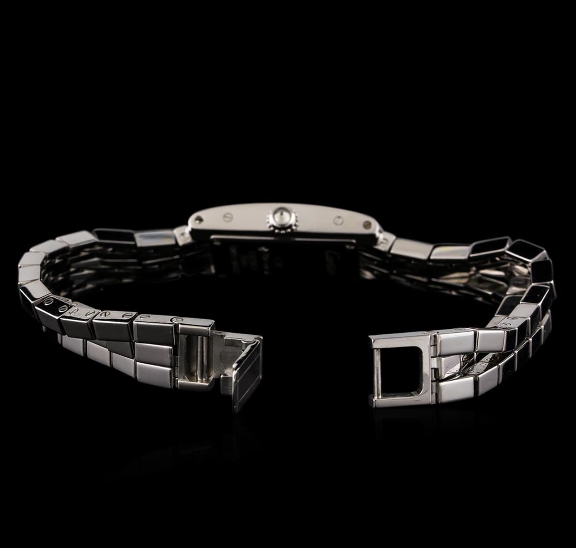 One ladies, Cartier Lanieres wristwatch, a Cartier mini Tank, electronically tested 18KT White gold, Case: 30 x 14mm, Swiss Hallmarked Case Back: secured by four set screws, engraved with the manufactures name, information, hallmarks, and ID numbers, Crown: scalloped, set with an inverted round brilliant diamond, Bezel: diamond set, Crystal: synthetic sapphire lens. Movement: quartz, Dial: patterned Silver color, with Blued steel pointed hands, and Cartier Roman numerals, Bracelet: three 18KT White gold Cartier ribbons, Condition: G-6 Extra Fine. Bright polish finish. Six and one quarter inch length. Over-locking clasp. Containing: One bezel set inverted round brilliant cut diamond, measuring 2.60 - 2.60 x 1.56mm (depth est.) approximate weight of 0.07ct. Graded in the setting. Clarity: VVS-2. Color: H Eighteen prong set round brilliant cut diamonds, measuring 1.70 - 1.60 x 0.99mm(depth est.) approximate total weight of 18 Stones = 0.30ct. Graded in the setting. Clarity: VVS-1 to VVS-2 Color F - G. Total Weight of Diamonds 0.37ct. Total Weight of Watch 73.74gm. AIG Appraised at $11,000.00.