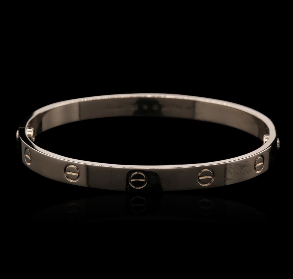 One electronically tested 18KT white gold ladies cast & assembled bangle bracelet with a bright polish finish. The one-quarter inch wide seven inch wearable length bangle bracelet is from Cartier's LOVE Collection. It features ten iconic screw motifs and two actual screws that allow the bangle bracelet to be easily put on and taken off. The bangle bracelet is stamped WY 7768. Trademark is Cartier. Identified with markings of "750". Condition is good. Total Weight of Bangle Bracelet 37.63 grams. AIG Appraised at $7,100.00.