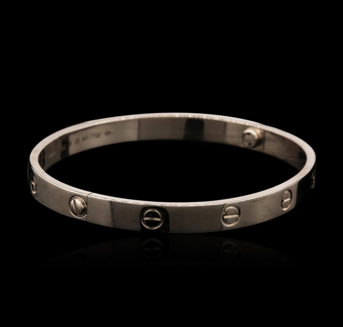 One electronically tested 18KT white gold ladies cast & assembled bangle bracelet with a bright polish finish. The one-quarter inch wide seven inch wearable length bangle bracelet is from Cartier's LOVE Collection. It features ten iconic screw motifs and two actual screws that allow the bangle bracelet to be easily put on and taken off. The bangle bracelet is stamped WY 7768. Trademark is Cartier. Identified with markings of "750". Condition is good. Total Weight of Bangle Bracelet 37.63 grams. AIG Appraised at $7,100.00.
