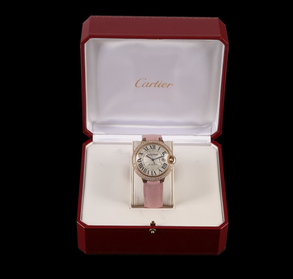 One, Ballon Bleu de Cartier wristwatch electronically tested 18KT yellow gold, Case: 41mm, water resistant to 30 meters/100 feet, Swiss Hallmarked Case Back: Convex, secured with inset screws, Fluted Crown: set with a blue cabochon crystal, within a protective casing, Custom Bezel: two tiered diamond set, Crystal: anti-reflective domed synthetic sapphire. Movement: automatic, with a 3 o'clock position date window, Dial: Silvered, with sword shaped Blued steel hands & Roman numerals, Cartier Bracelet: leather strap with a Pink color satin finish; seven inch length, adjustable. Condition: G-5 Fine. 18KT gold Cartier concealed deployment clasp. Containing: Numerous pave & prong set round brilliant cut diamonds, approximate total weight = 2.00ct. Set & graded in the bezel. Clarity: VVS-2. Color: E-F. Total Weight of Watch: 144.56 grams. AIG Appraised at $44,000.00.