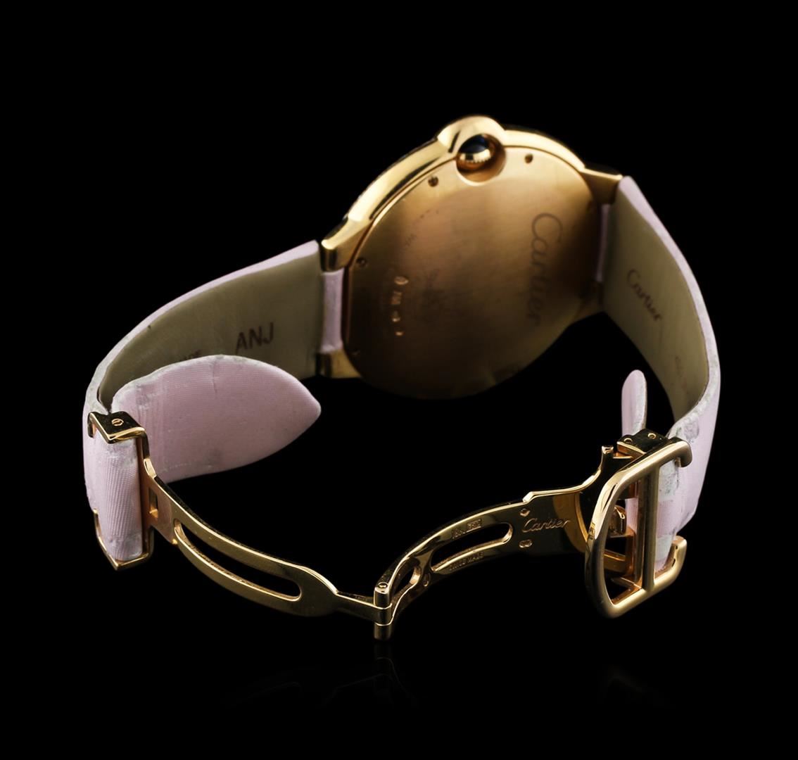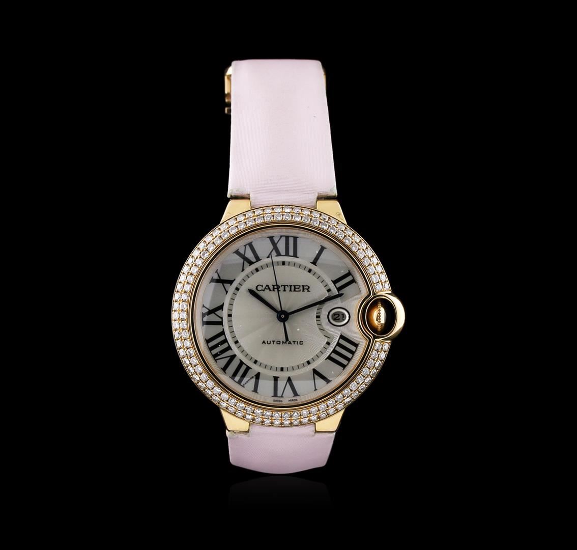 One, Ballon Bleu de Cartier wristwatch electronically tested 18KT yellow gold, Case: 41mm, water resistant to 30 meters/100 feet, Swiss Hallmarked Case Back: Convex, secured with inset screws, Fluted Crown: set with a blue cabochon crystal, within a protective casing, Custom Bezel: two tiered diamond set, Crystal: anti-reflective domed synthetic sapphire. Movement: automatic, with a 3 o'clock position date window, Dial: Silvered, with sword shaped Blued steel hands & Roman numerals, Cartier Bracelet: leather strap with a Pink color satin finish; seven inch length, adjustable. Condition: G-5 Fine. 18KT gold Cartier concealed deployment clasp. Containing: Numerous pave & prong set round brilliant cut diamonds, approximate total weight = 2.00ct. Set & graded in the bezel. Clarity: VVS-2. Color: E-F. Total Weight of Watch: 144.56 grams. AIG Appraised at $44,000.00.
