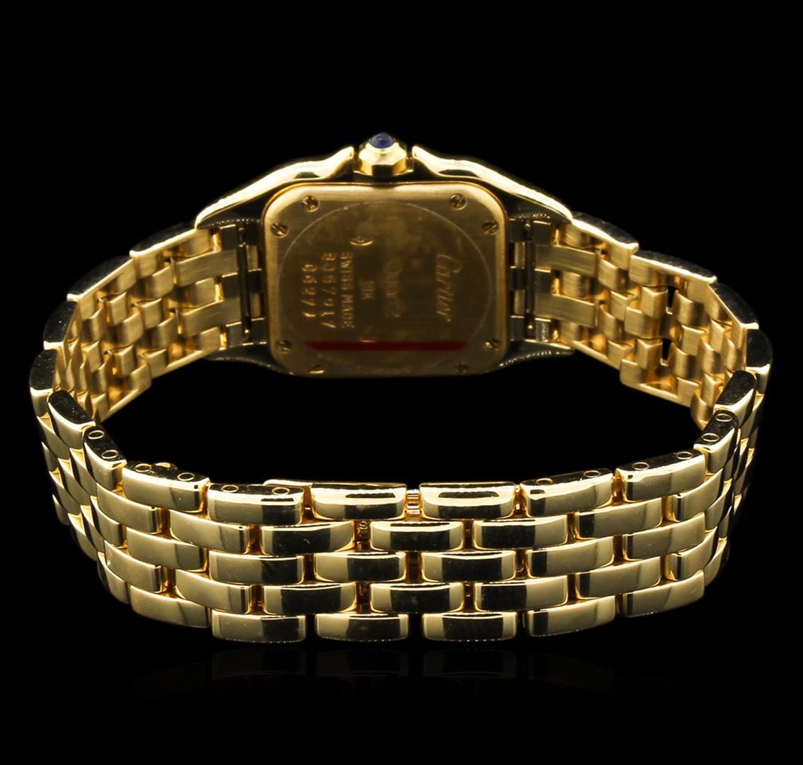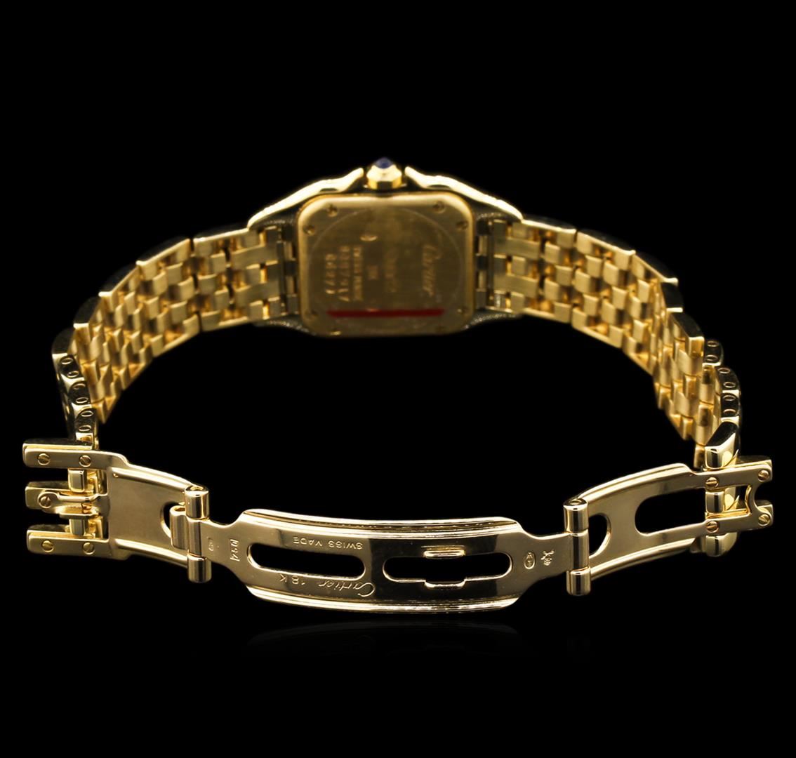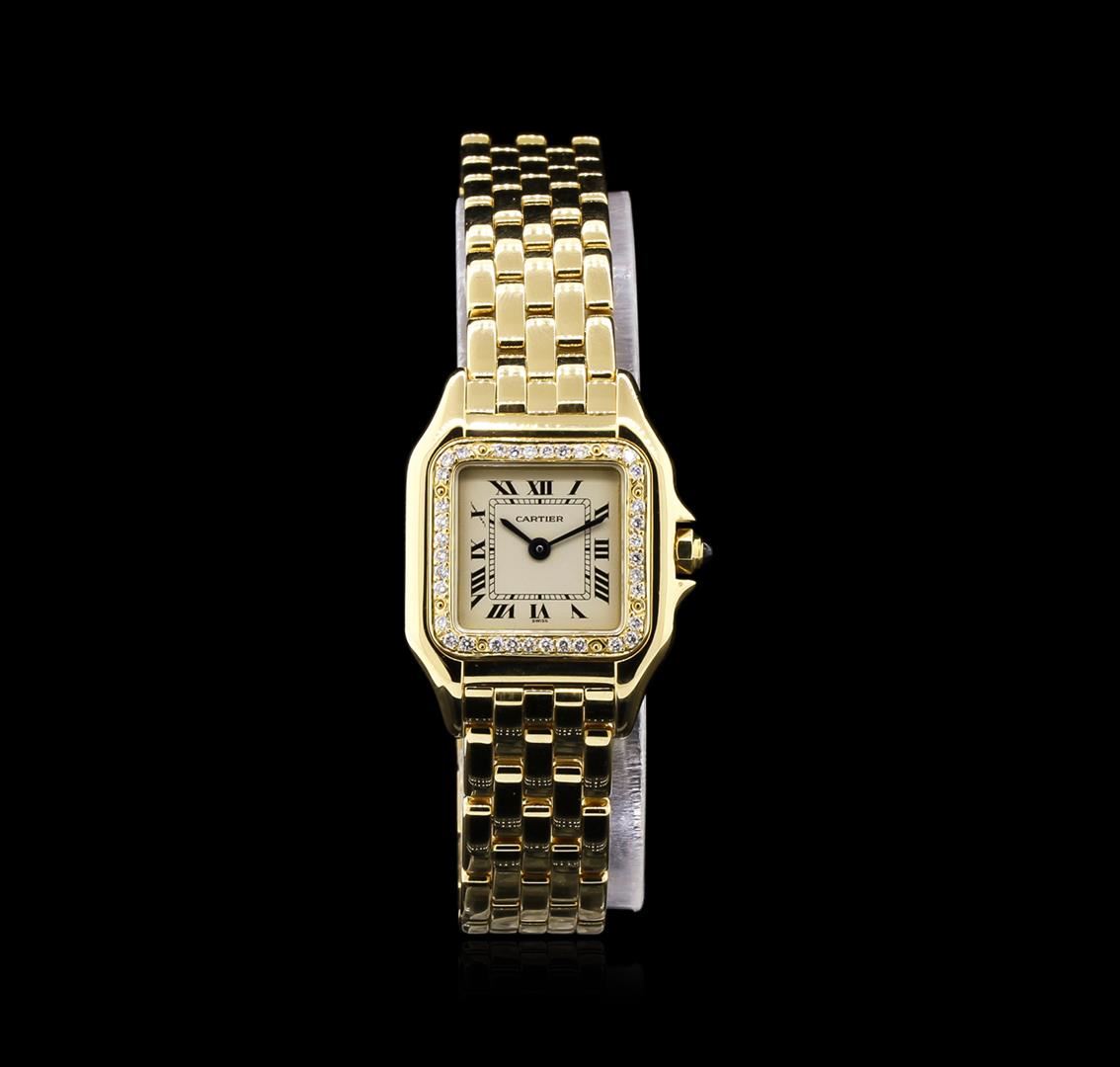 One ladies, Cartier Panthere wristwatch electronically tested 18KT yellow gold, Case: 30 x 22mm, engraved with the Swiss 18KT gold Hallmark, Crown: octagonal, set with a Blue cabochon crystal, Customized Bezel: diamond set, Crystal: synthetic sapphire. Movement: quartz, Dial: Ivory color, sword shaped Blued steel hands & Black roman numerals, Cartier Panthere Bracelet: 18KT yellow gold, Swiss Hallmarked, Condition: G-5 Fine. Bright polish finish. Six and one quarter inch length. Cartier Concealed deployment clasp. Containing: Thirty Six prong set round brilliant cut diamonds, approximate total weight = 0.30ct. Set & graded in the customized bezel. Clarity: VS-1 to SI-1. Color: F - H. Total Weight of Diamonds: 0.30ct. Total Weight of Watch: 66.33gm. AIG Appraised at $17,050.00.