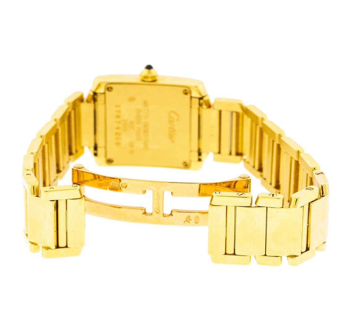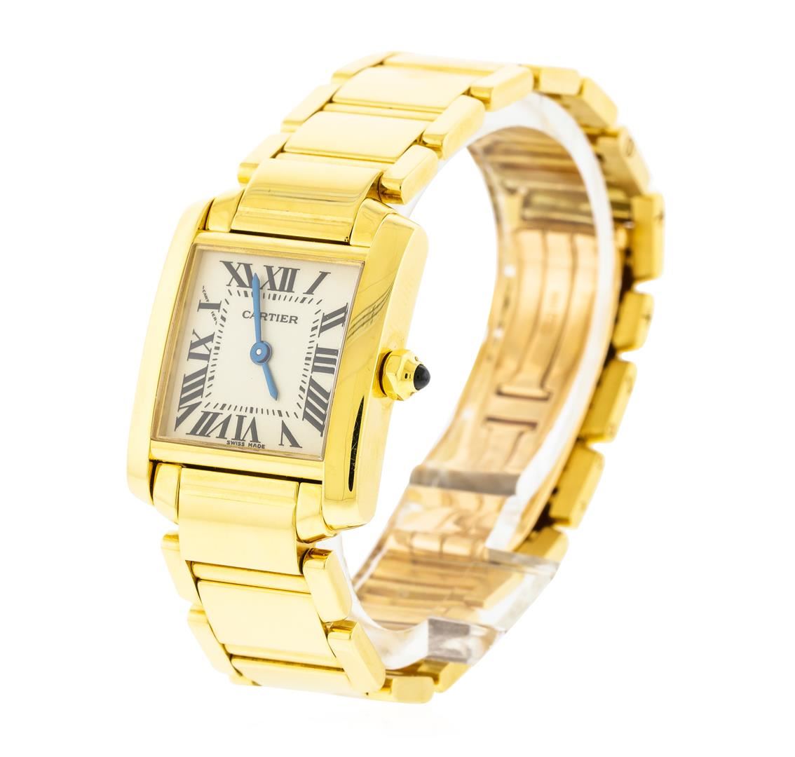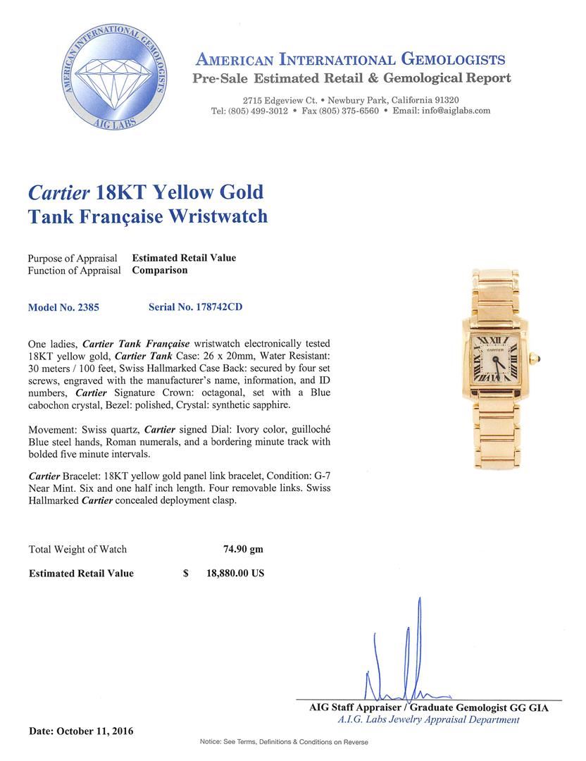 One ladies, Cartier Tank Francaise wristwatch electronically tested 18KT yellow gold, Cartier Tank Case: 26 x 20mm, Water Resistant: 30 meters / 100 feet, Swiss Hallmarked Case Back: secured by four set screws, engraved with the manufacturer's name, information, and ID numbers, Cartier Signature Crown: octagonal, set with a Blue cabochon crystal, Bezel: polished, Crystal: synthetic sapphire. Movement: Swiss quartz, Cartier signed Dial: Ivory color, guilloche, Blue steel hands, Roman numerals, and a bordering minute track with bolded five minute intervals. Cartier Bracelet: 18KT yellow gold panel link bracelet, Condition: G-7 Near Mint. Six and one half inch length. Four removable links. Swiss Hallmarked Cartier concealed deployment clasp. Total Weight of Watch 74.90gm. AIG Appraised at $18,880.00.