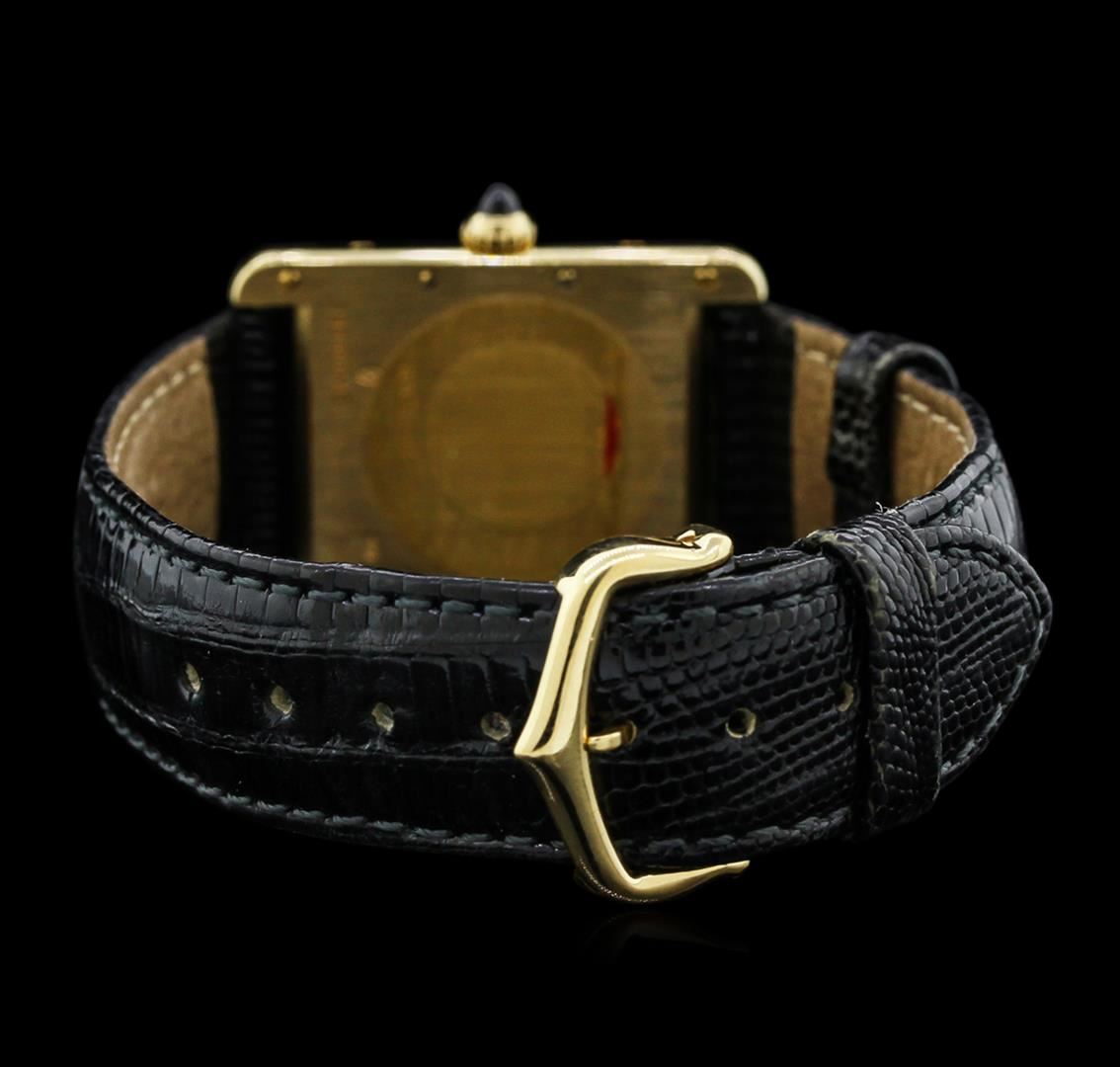 One, Tank Louis Cartier wristwatch electronically tested 18KT yellow gold, Case: 34 x 25mm, Swiss Hallmarked Case Back: secured with eight set screws, and engraved with the manufacturers name & ID numbers, Crown: scalloped, set with a cabochon crystal, Bezel: polished yellow gold, Crystal: synthetic sapphire. Movement quartz, Cartier Signed Dial: Ivory color, with sword shaped Blue steel hands & Black Roman numerals, Date Window: 3 o'clock position, Bracelet: saddle stitched Black leather strap, Condition: G-5 Fine. Bright polish finish. Seven inch length. 18KT yellow gold Cartier buckle. Total Weight of Watch: 38.90 grams. AIG Appraised at $9,050.00.