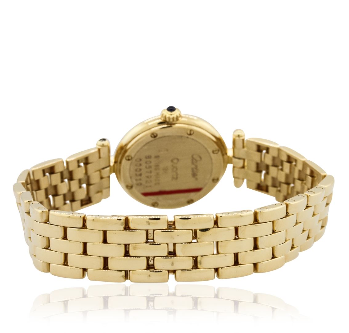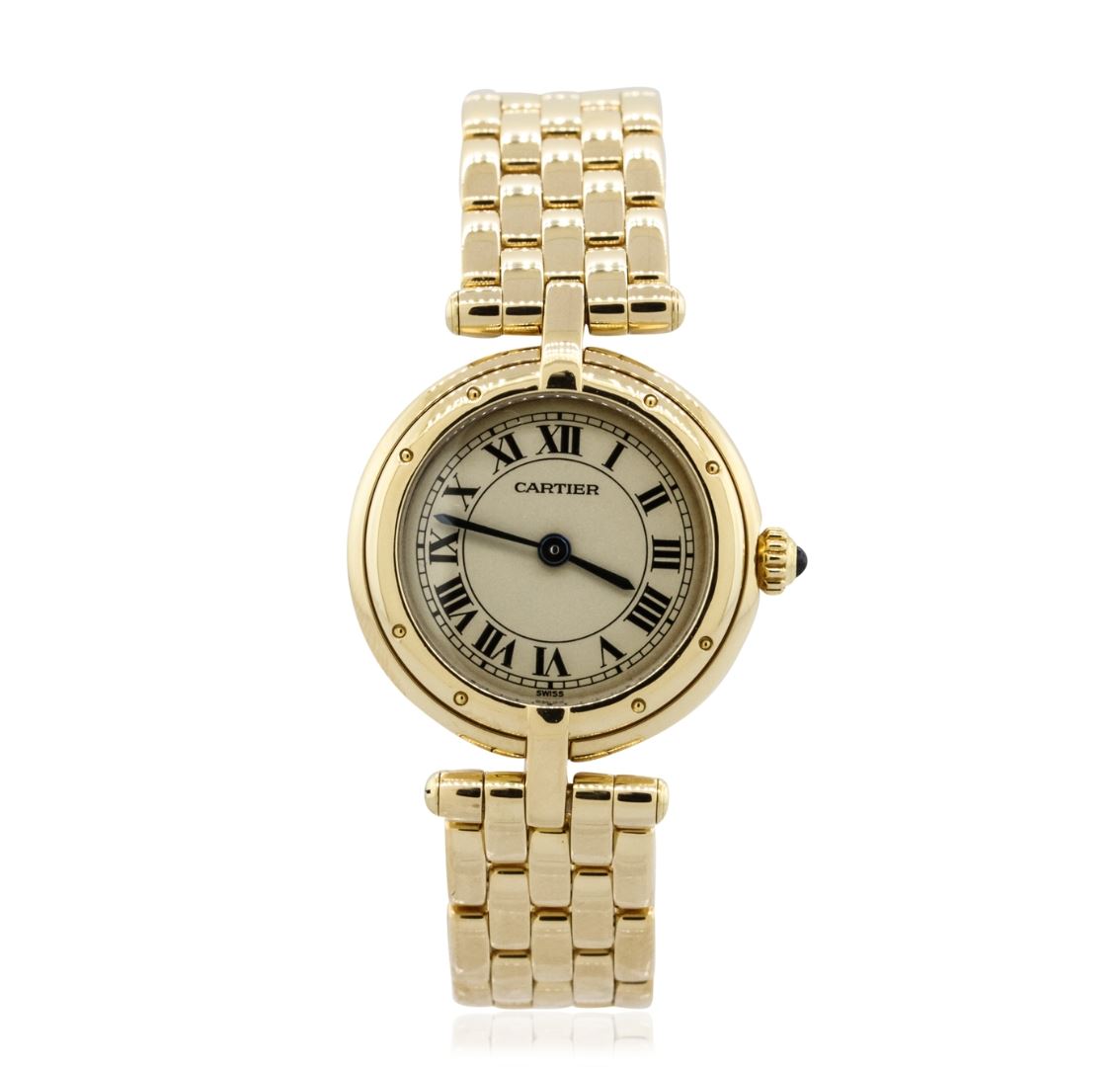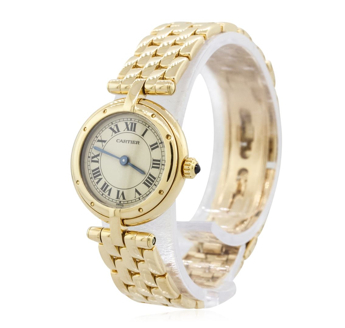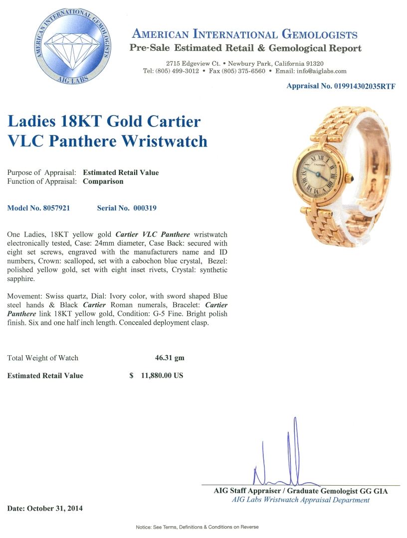 One Ladies, 18KT yellow gold Cartier VLC Panthere wristwatch electronically tested, Case: 24mm diameter, Case Back: secured with eight set screws, engraved with the manufacturers name and ID numbers, Crown: scalloped, set with a cabochon blue crystal, Bezel: polished yellow gold, set with eight inset rivets, Crystal: synthetic sapphire. Movement: Swiss quartz, Dial: Ivory color, with sword shaped Blue steel hands & Black Cartier Roman numerals, Bracelet: Cartier Panthere link 18KT yellow gold, Condition: G-5 Fine. Bright polish finish. Six and one half inch length. Concealed deployment clasp. Total Weight of Watch 46.31 grams. AIG Appraised at $11,880.00.