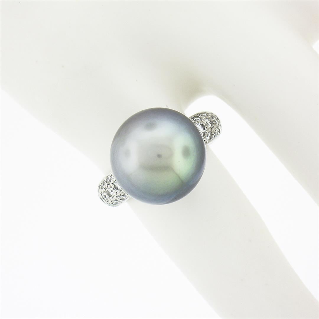 A solid 18k white gold ring by Cartier, with 1 round shape cultured tahitian pearl (12.75mm), and 42 round brilliant cut natural diamonds (VVS2 ; E/F - 0.85ctw). The ring is size 4.0, weighs a total of 8.80 grams, and measures 12.75mm wide.