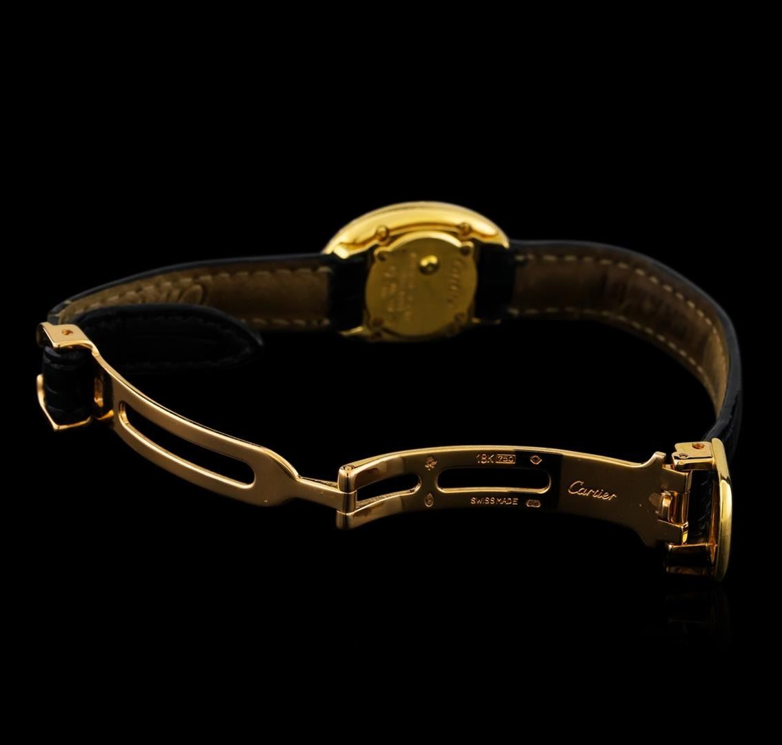 One Cartier Baignoir Mini lady's watch featuring: Case: Oval 25mm x 18mm 18KT yellow gold. Dial: Silver with pointed baton-type hands and black roman numerals. Bezel: 18KT yellow gold set with diamonds. Bracelet: black leather with 18KT yellow gold deployment buckle. Movement: Quartz. Condition: light wear on case and bracelet but otherwise great condition.