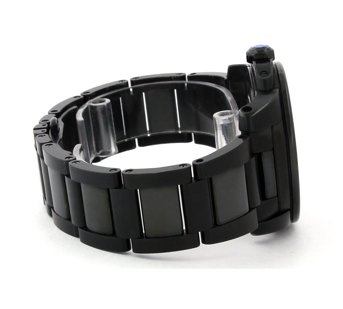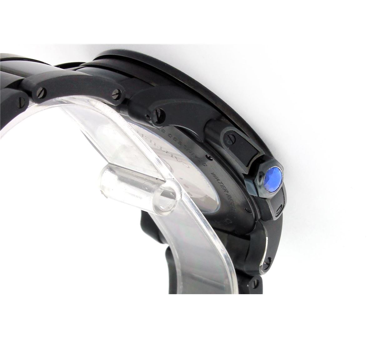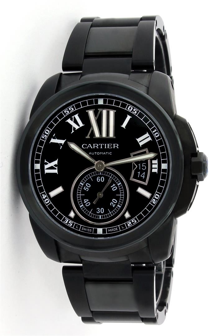 One Gents Cartier Black Calibre DLC Unworn, Case:42mm Black DLC, Black DLC Crown, Bezel: DLC Bezel, Crystal: Sapphire Lens. Movement: 1904-PS MC . Dial: Black Roman Dial With Date At 3'O Clock Position, Second Counter at 6'O Clock Position. Model# W7100016 Condition: G-8 Extra Fine This Watch Is Brand New And In Unworn Condition. Band: Black PVD Band, 7.5 Inch Length, Adjustable, With Black DLC Cartier Buckle.