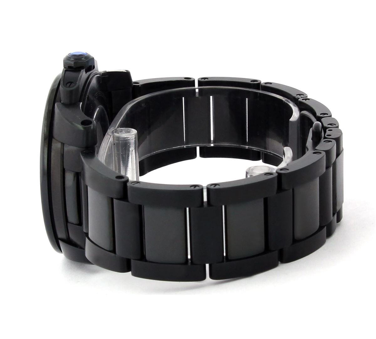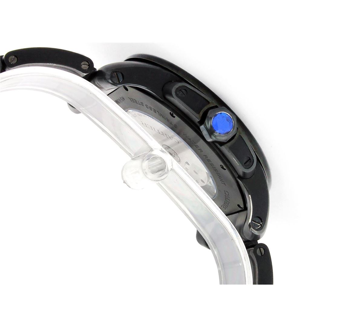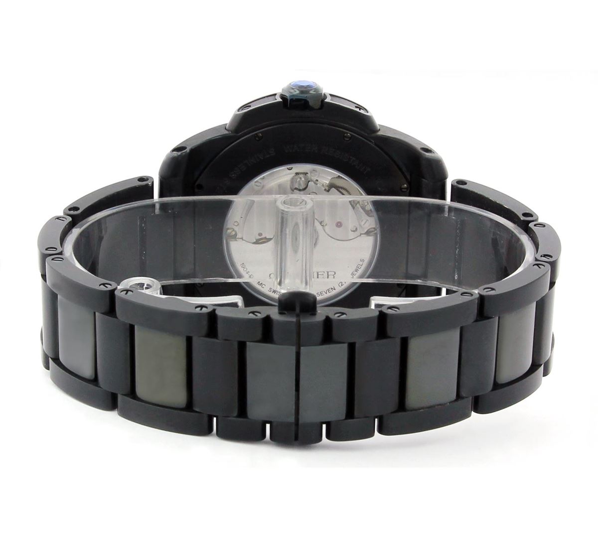 One Gents Cartier Black Calibre DLC Unworn, Case:42mm Black DLC, Black DLC Crown, Bezel: DLC Bezel, Crystal: Sapphire Lens. Movement: 1904-PS MC . Dial: Black Roman Dial With Date At 3'O Clock Position, Second Counter at 6'O Clock Position. Model# W7100016 Condition: G-8 Extra Fine This Watch Is Brand New And In Unworn Condition. Band: Black PVD Band, 7.5 Inch Length, Adjustable, With Black DLC Cartier Buckle.