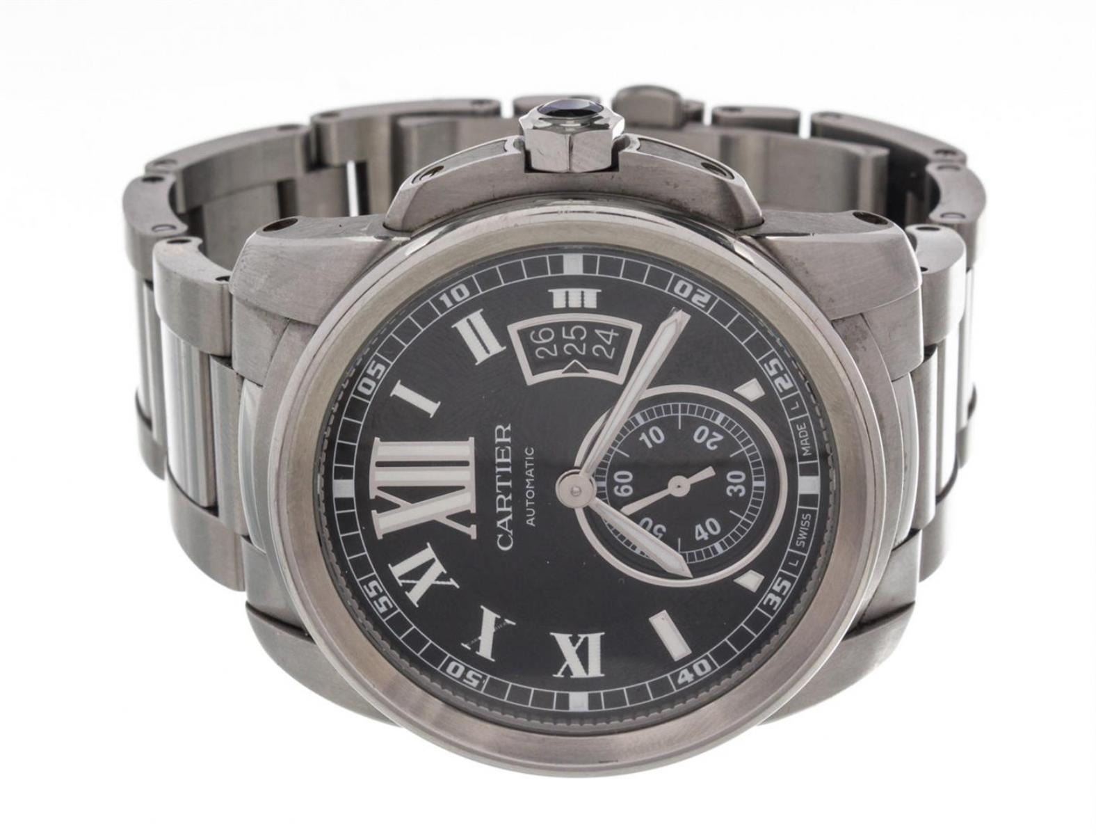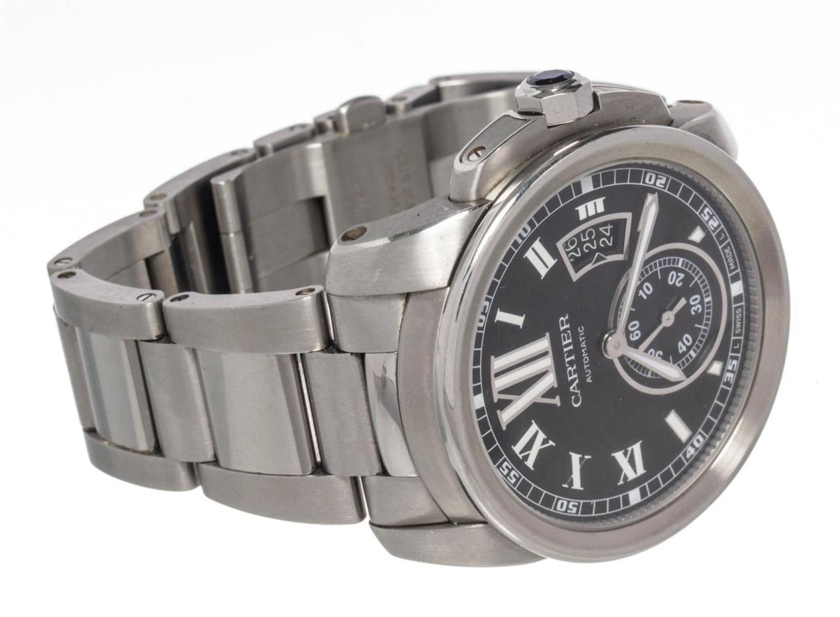 Cartier Black Face Calibre De Cartie Watch with silver-tone hardware.