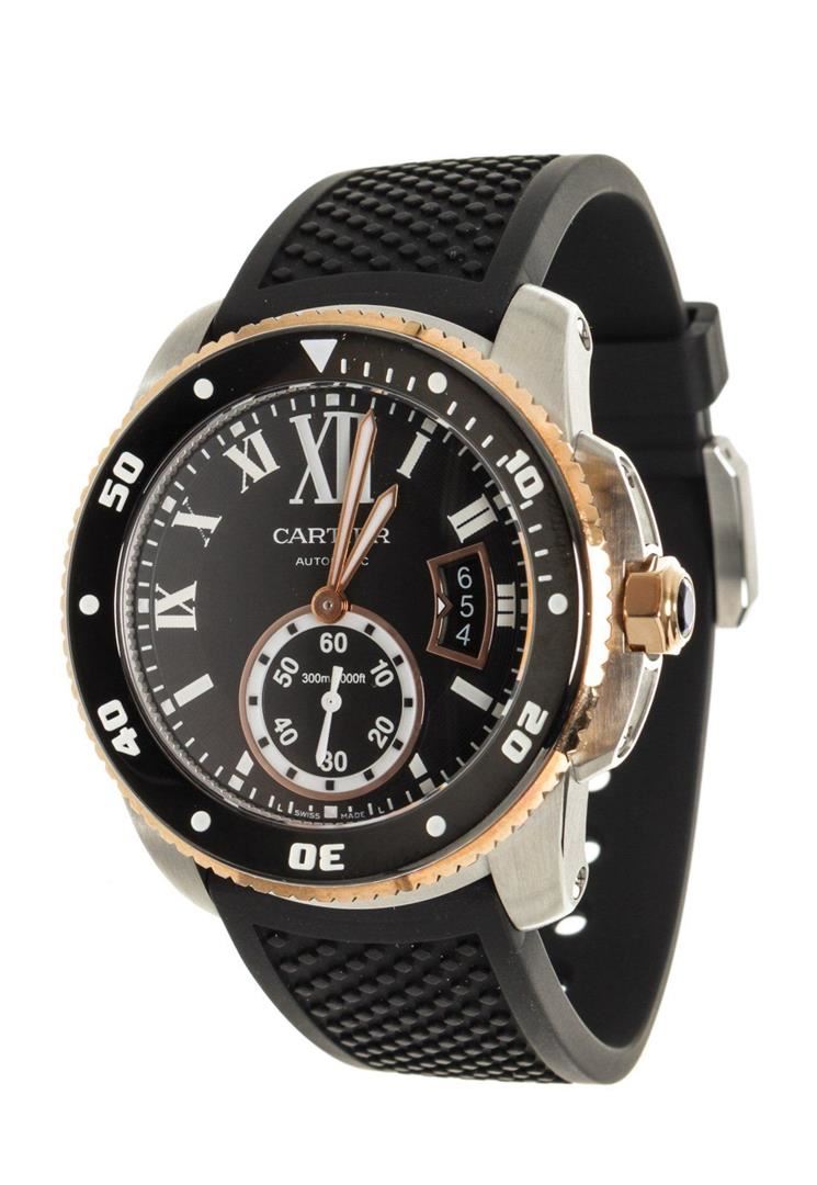 Cartier Black Leather Calibre Diver Stainless Steel Watch with gold-tone hardware.