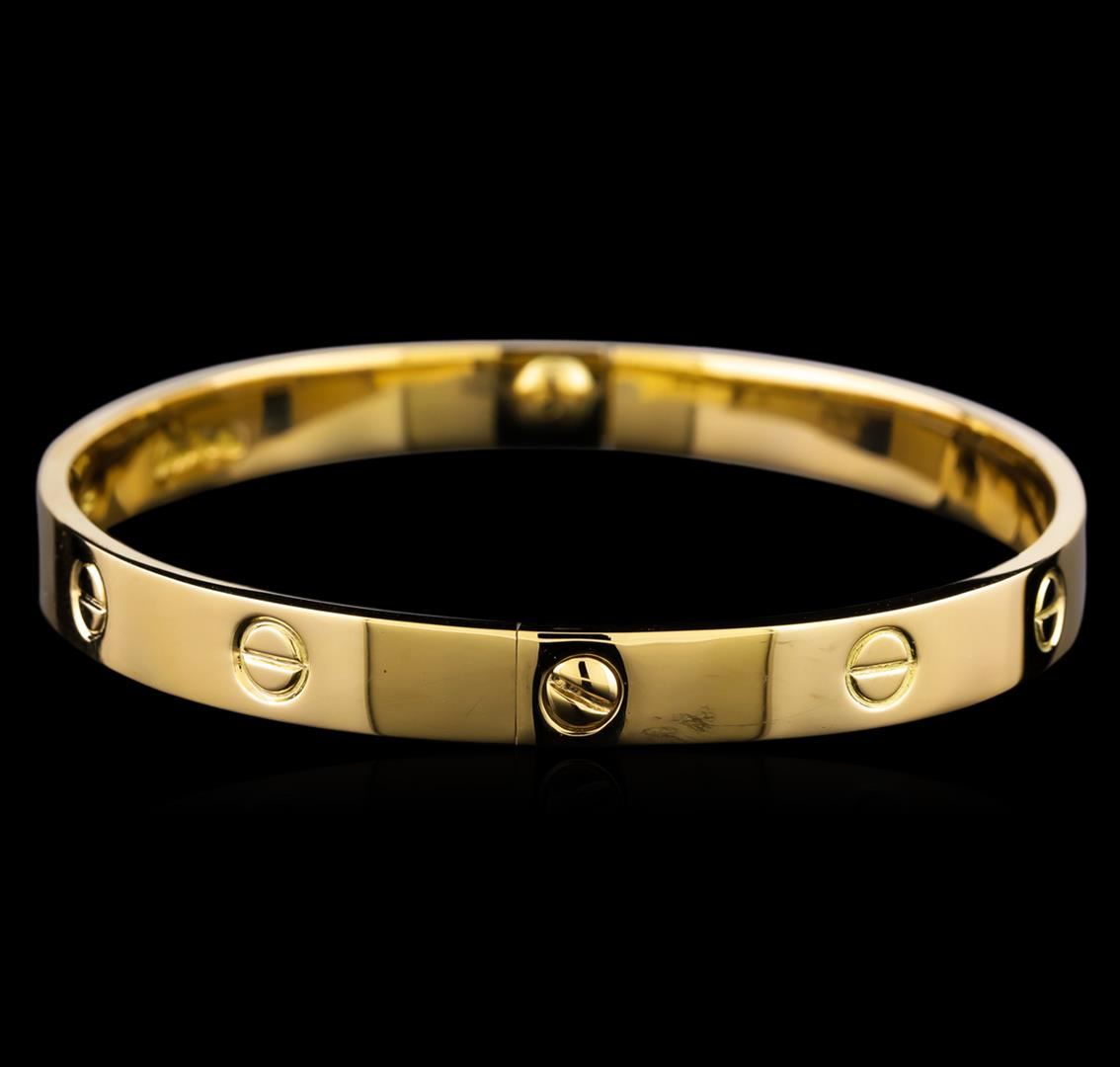 One Cartier bracelet with screwdriver including: 18KT Yellow gold, Bracelet with a total weight of 34.4 grams and Screwdriver with a total weight of 8.2 grams. Markings of "Cartier", "Love Bracelet", and "18KT" on the inside of the bracelet.