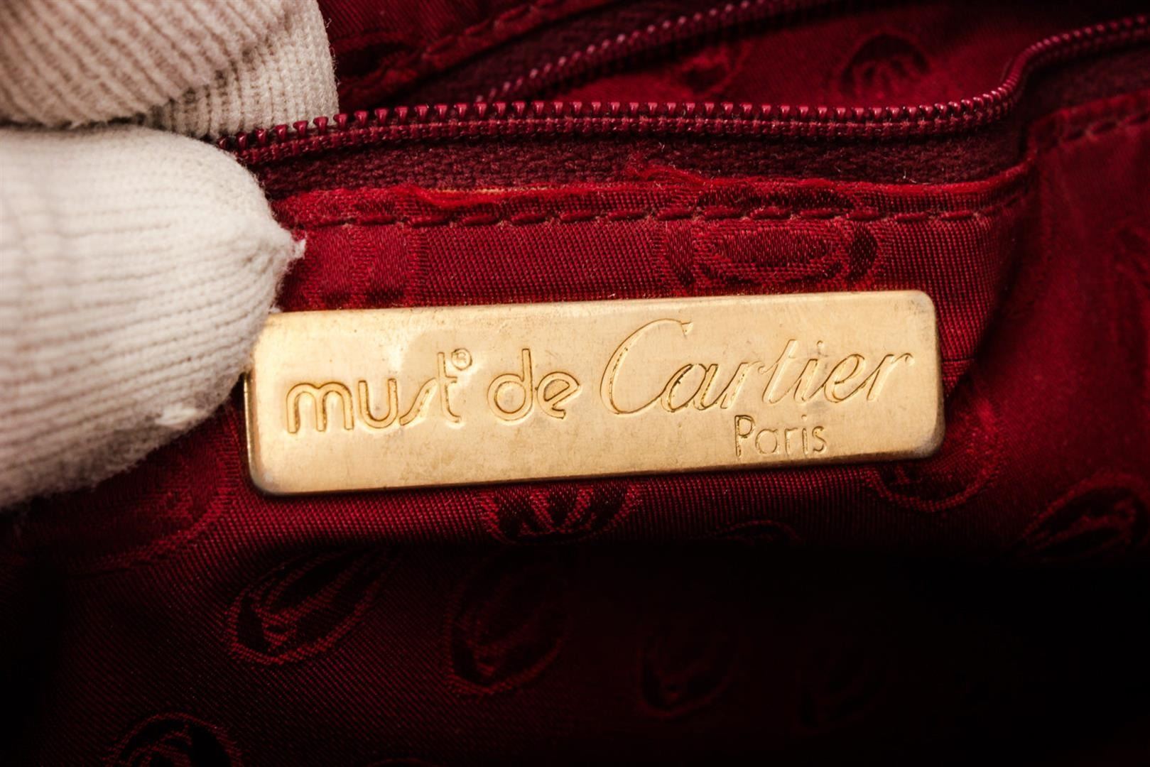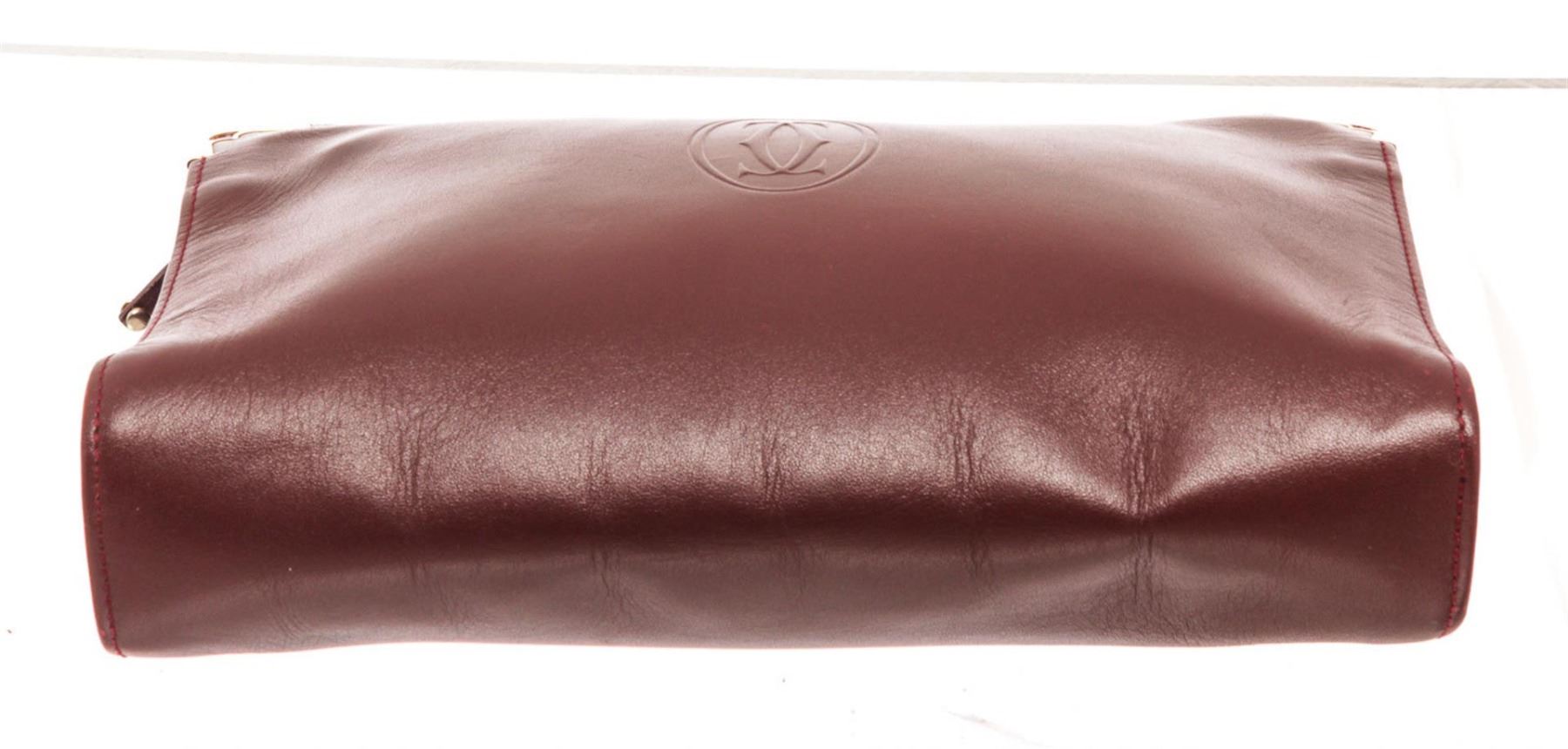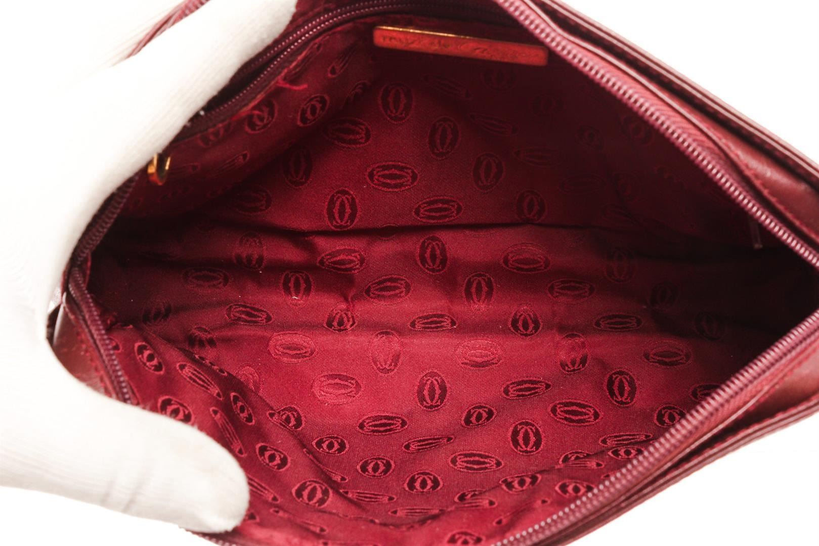 Cartier Burgundy Must De Cartier Wallet with gold-tone hardware, trim leather, leather lining interior zip pocket and zipper closure.