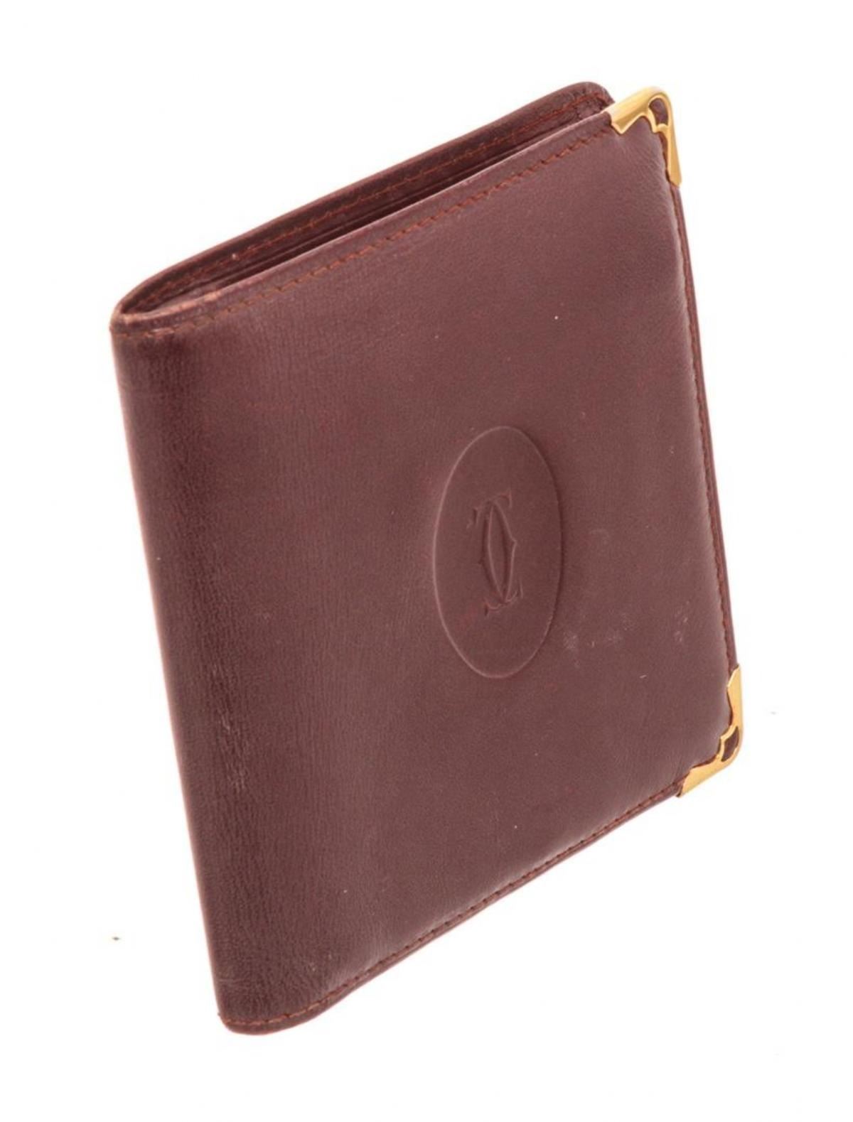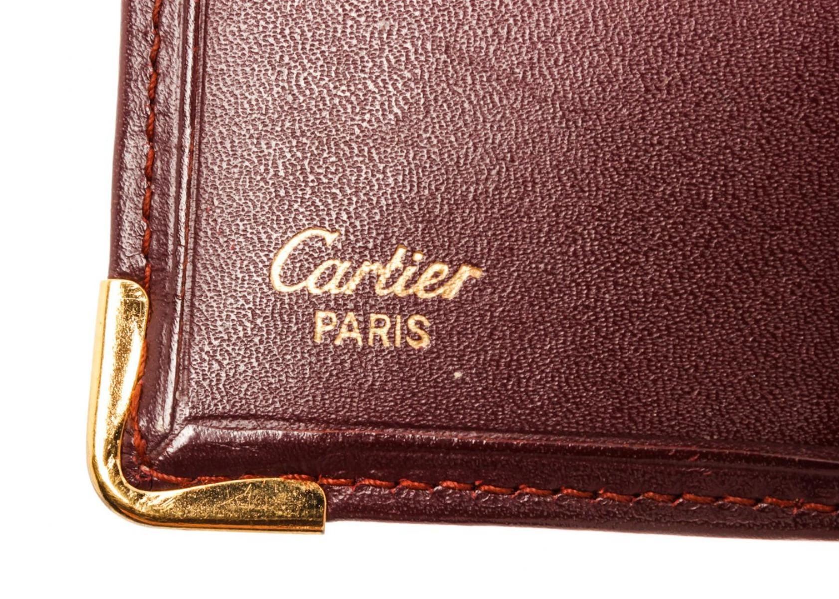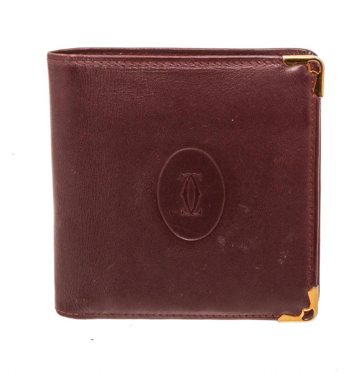Cartier Burgundy Two Fold Wallet with gold-tone hardware, trim leather, interior card holder pocket, leather lining and flap closure.