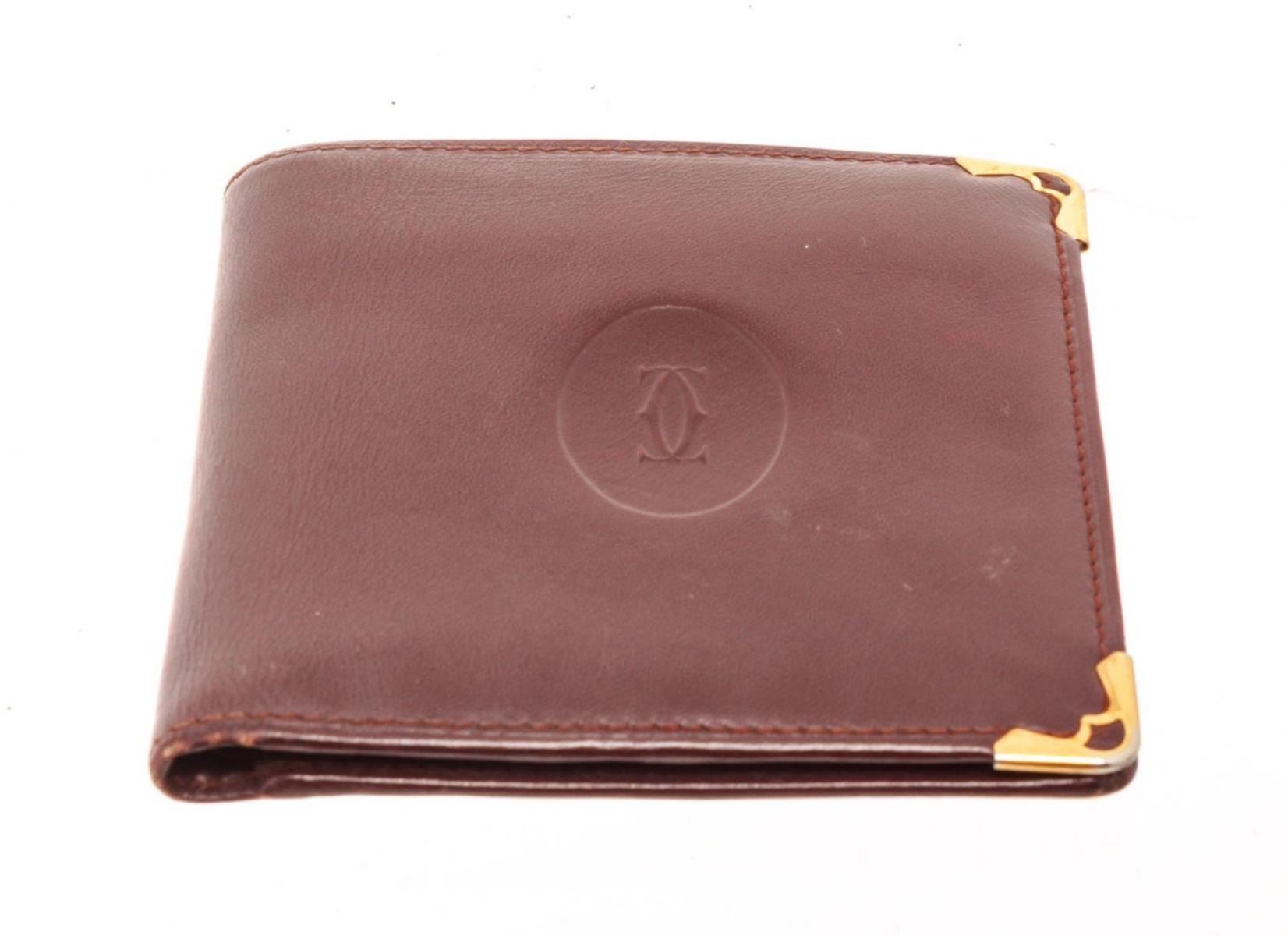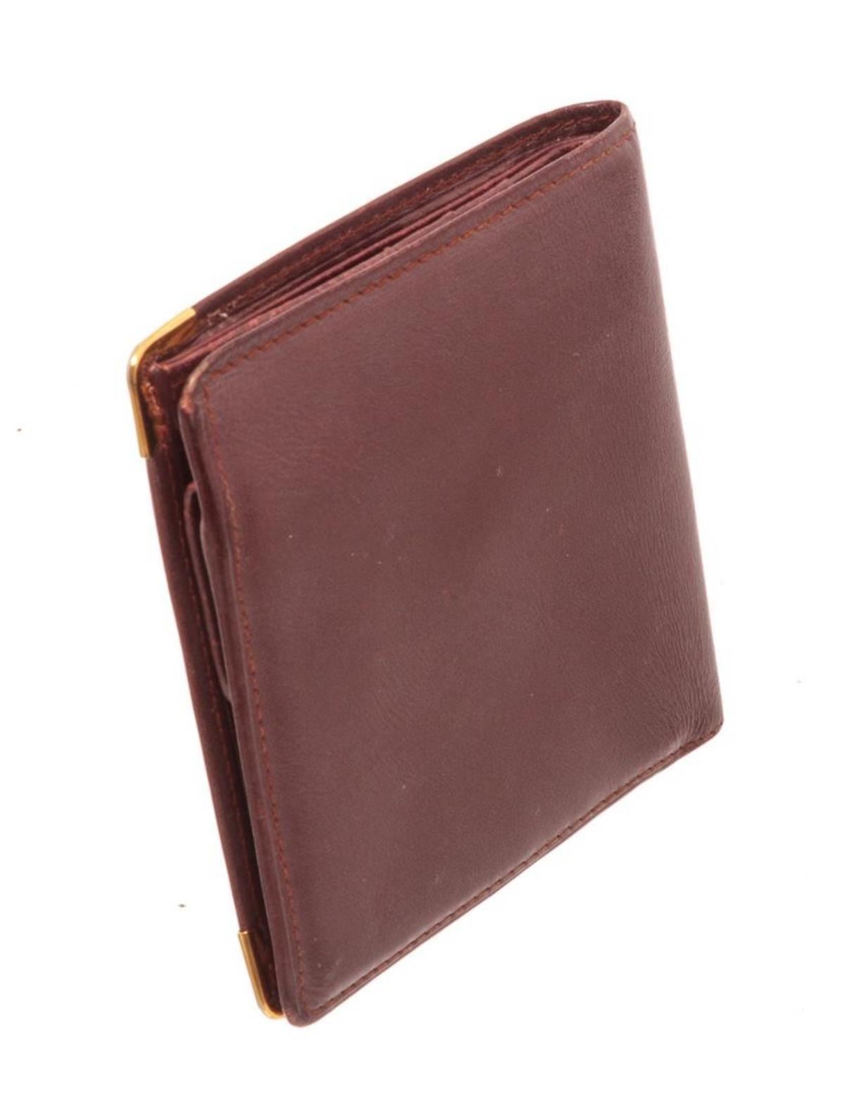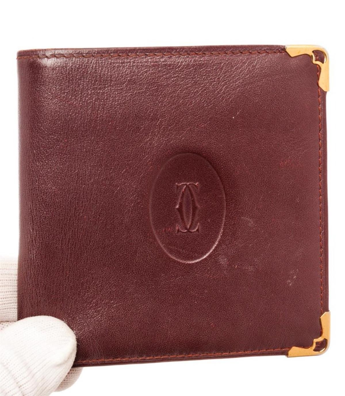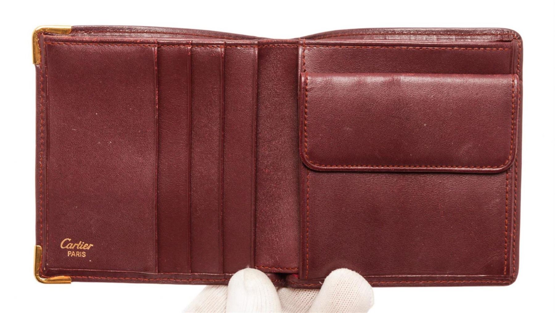 Cartier Burgundy Two Fold Wallet with gold-tone hardware, trim leather, interior card holder pocket, leather lining and flap closure.