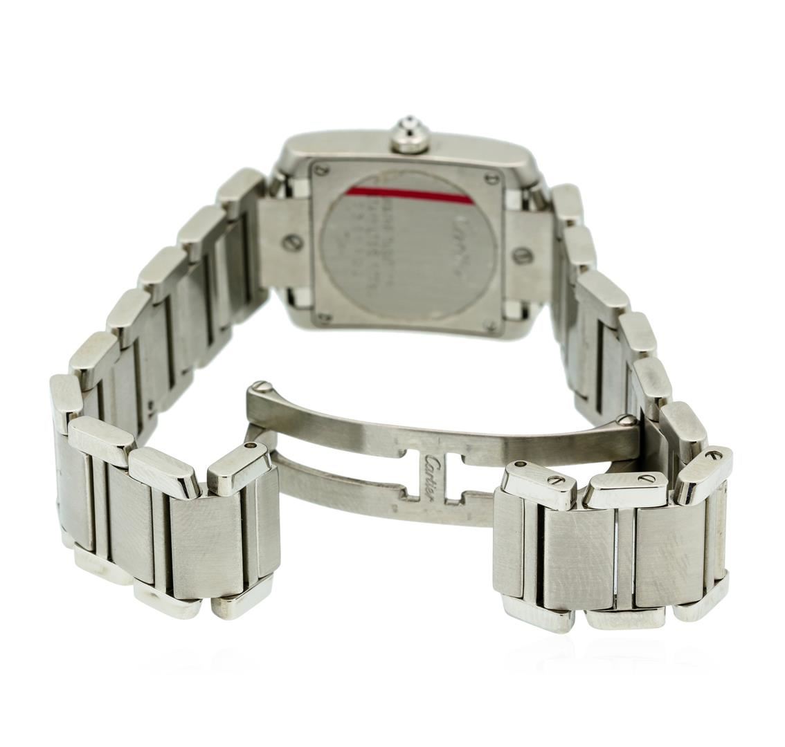 One ladies Cartier Tank Francaise wristwatch electronically tested stainless steel, Case: 26 x 20mm, Case Back: secured by four set screws, engraved with the manufacturers name and information, Crown: Octagonal, set with an inverted diamond, Customized Bezel: diamond set, Crystal: synthetic sapphire lens. Movement: Swiss quartz, Cartier signed Dial: Ivory color, with sword shaped Blued Steel hands, Roman numerals, and a bordering minute track with bolded five minute intervals. Cartier Bracelet: stainless steel integral rectangular panel links, Condition: G-6 Extra Fine. Brushed & bright polish finish. Six and one half inch length. Four removable links. Cartier signed Concealed deployment clasp. Containing: Twenty-Eight prong set round brilliant cut diamonds, measuring 1.80 - 1.70 x 1.05mm, approximate total weight of 28 Stones = 0.59ct. Graded in the setting. Clarity: SI-1 to I-1 Color E - G Average. Total Weight of Diamonds 0.59ct. Total Weight of Watch 56.97gm. AIG Appraised at $5,050.00.