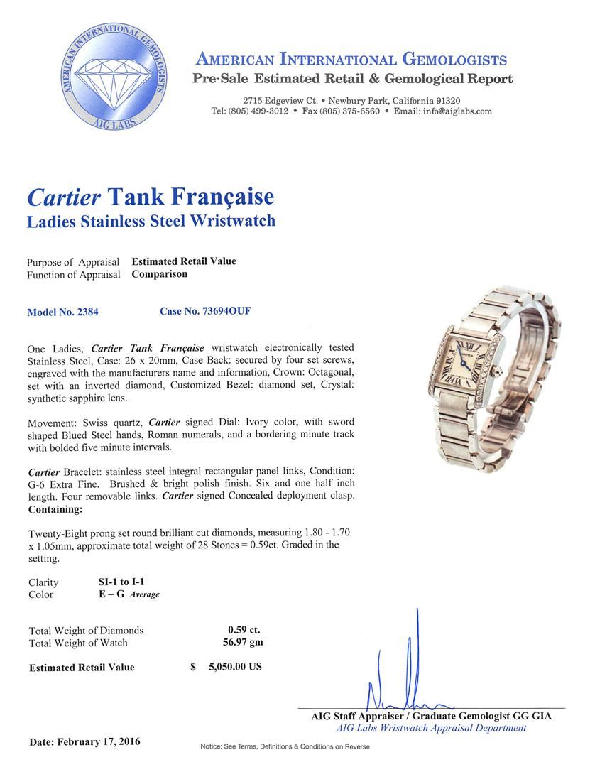 One ladies Cartier Tank Francaise wristwatch electronically tested stainless steel, Case: 26 x 20mm, Case Back: secured by four set screws, engraved with the manufacturers name and information, Crown: Octagonal, set with an inverted diamond, Customized Bezel: diamond set, Crystal: synthetic sapphire lens. Movement: Swiss quartz, Cartier signed Dial: Ivory color, with sword shaped Blued Steel hands, Roman numerals, and a bordering minute track with bolded five minute intervals. Cartier Bracelet: stainless steel integral rectangular panel links, Condition: G-6 Extra Fine. Brushed & bright polish finish. Six and one half inch length. Four removable links. Cartier signed Concealed deployment clasp. Containing: Twenty-Eight prong set round brilliant cut diamonds, measuring 1.80 - 1.70 x 1.05mm, approximate total weight of 28 Stones = 0.59ct. Graded in the setting. Clarity: SI-1 to I-1 Color E - G Average. Total Weight of Diamonds 0.59ct. Total Weight of Watch 56.97gm. AIG Appraised at $5,050.00.
