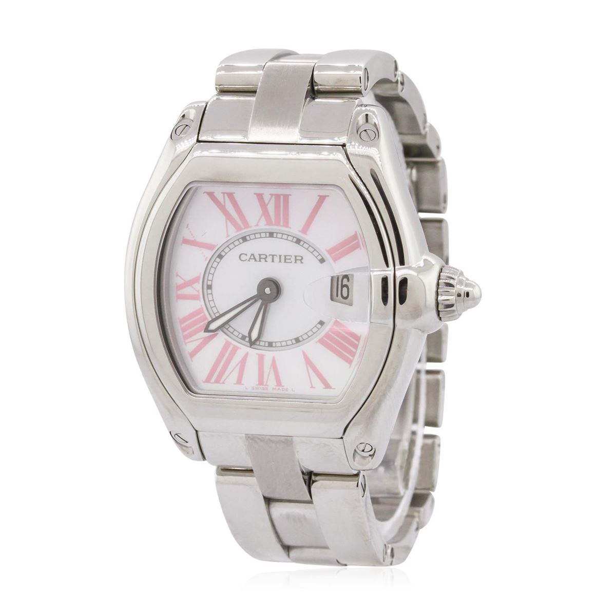 One ladies Cartier LadyRoadster wristwatch featuring: Stainless Steel Case, Mother of Pearl Dial, Pink Roman Numerals.