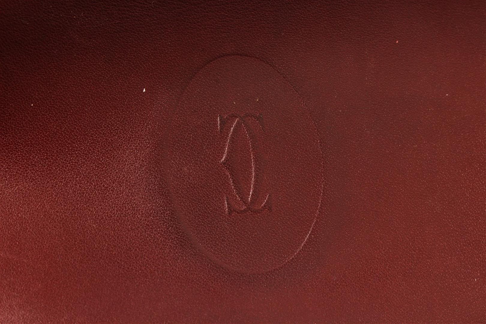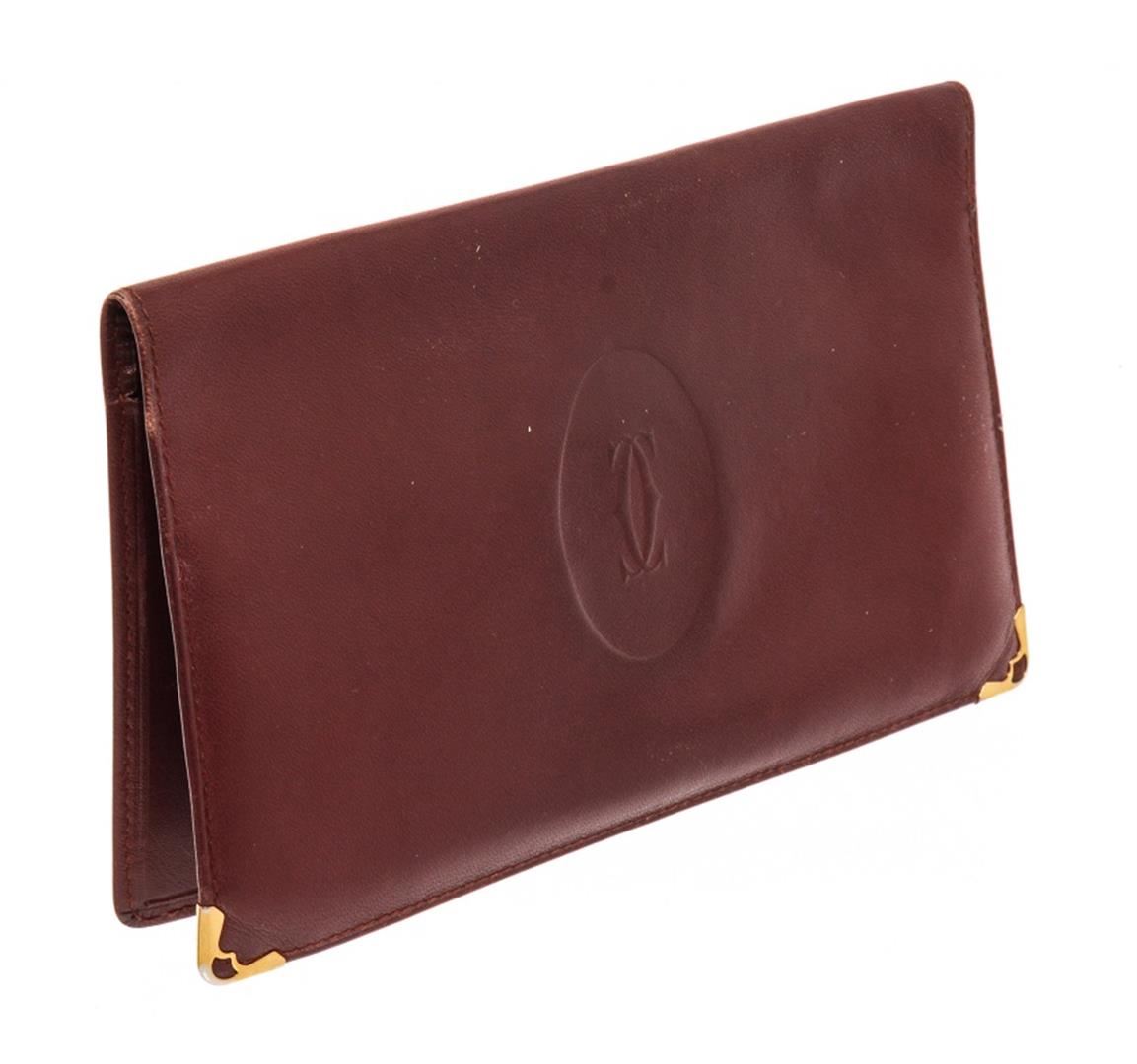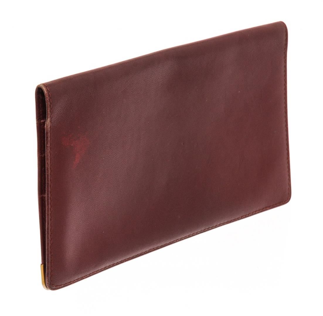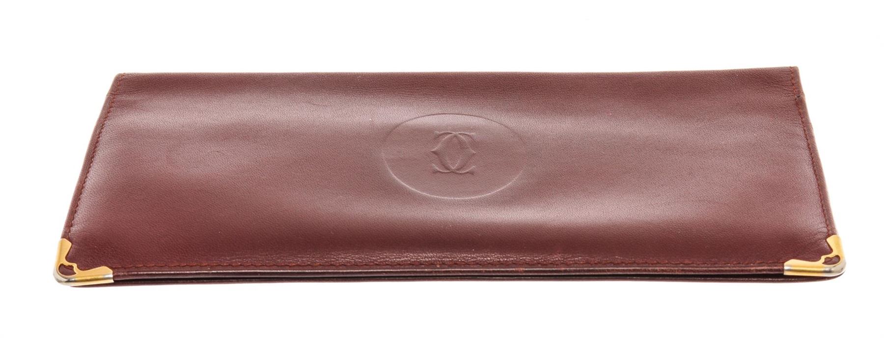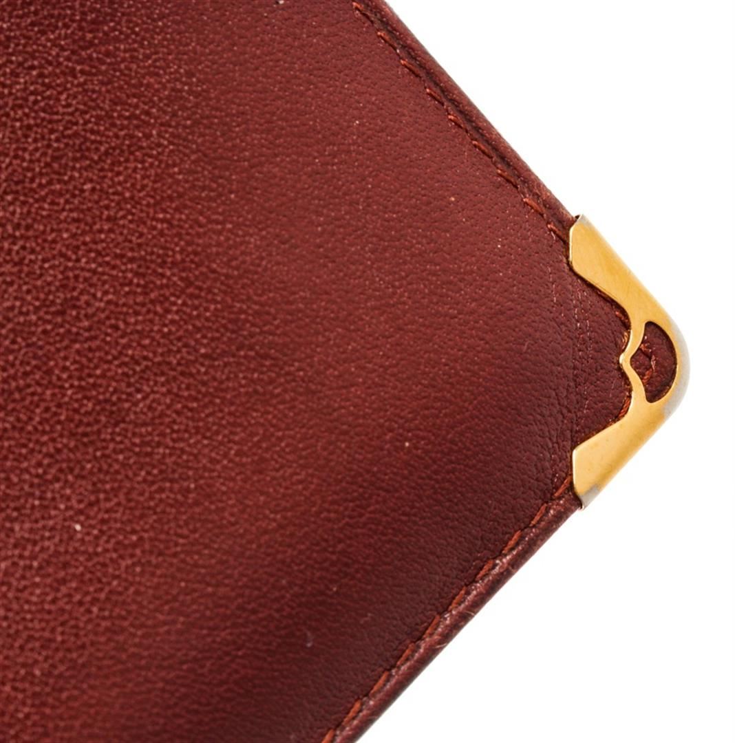 Cartier Maroon Leather Long Checkbook Wallet. All available information is listed in the description and shown in the photos. cartier maroon leather long checkbook wallet with burgundy leather, double c" logo at front, gold-tone hardwre, four interior pocket with card slots, long wallet, metal corner, includes authenticity card, flap closure. Height: 4.33" Width: 7.28" Depth: 0.19", / 11 x 18.5 x 0.5 Cm