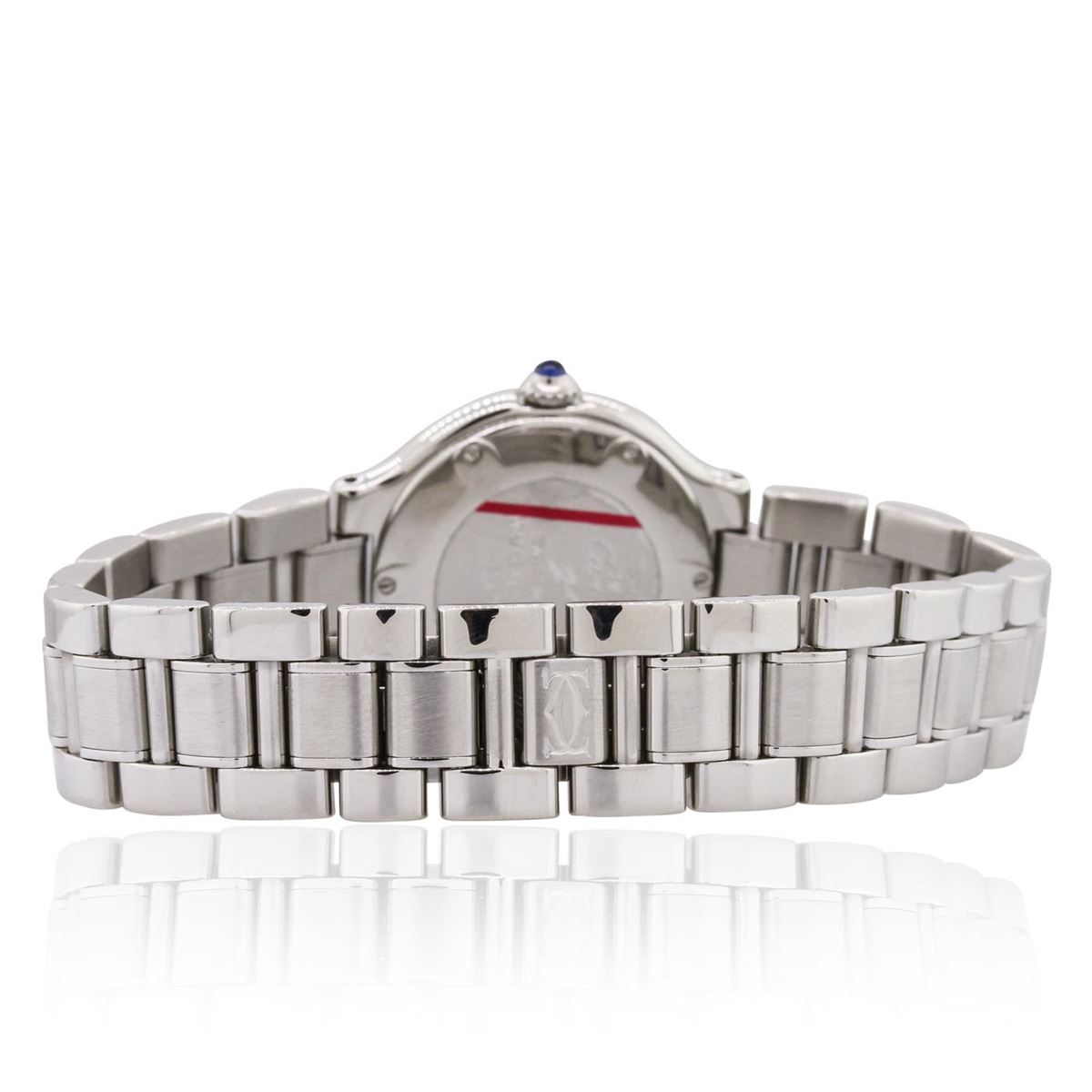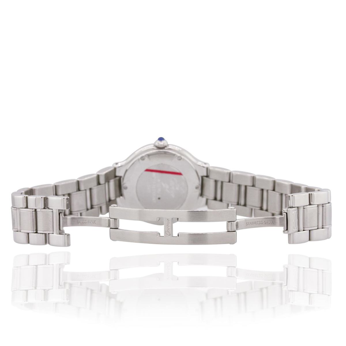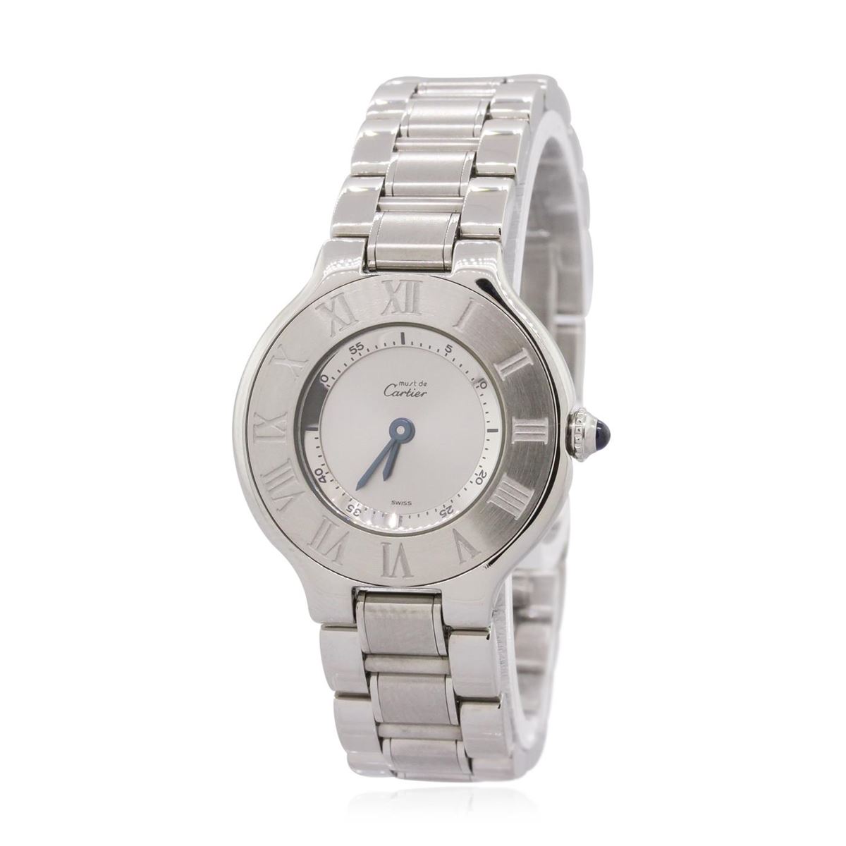 One Cartier Must De 21 wristwatch featuring: Stainless Steel bracelet with deployment clasp, bezel with Roman numerals, case, crown, and lugs, white dial with analog display, Swiss movement, blue hour and minute hands. This item measures 30mm across, including crown, and weighs a total of 61.50 grams.