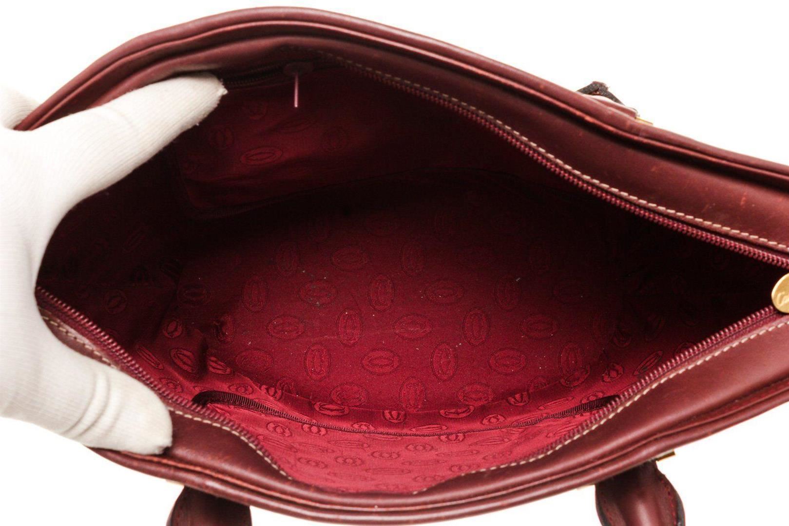 Cartier Red Leather Must de Cartier Shoulder Bag. All available information is listed in the description and shown in the photos. Red leather Cartier Must de Cartier shoulder bag with gold-tone hardware, dual rolled leather straps, a top zip closure, red logo jacquard lining, an interior zip and slip pocket. Size (HxWxD): 25cm x 20cm x 10cm / 9.84'' x 7.87'' x 3.93'', Handle Length: 44cm / 17.32''