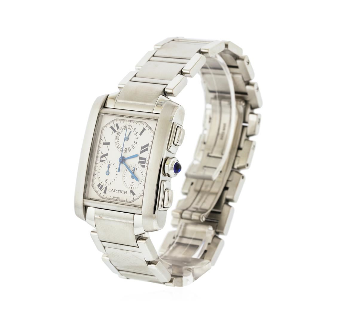 One gents, Cartier Tank Francaise Chronoflex Chronograph Quartz wristwatch electronically tested stainless steel, Case: 37 x 28mm, Case Back: secured by four set screws, engraved with the manufacturers name and ID numbers, Cartier Signature Crown: octagonal, set with a blue cabochon crystal, Bezel: brushed finish, Crystal: synthetic sapphire, Movement: quartz. Cartier signed Dial: Ivory color, with Blued steel pointed hands and Cartier Roman numerals, Chronograph Functions: sub dials for; date, minutes, and hours, Cartier Bracelet: stainless steel brushed finish panels, each set within a high polish finished frame, Condition: G-6 Extra Fine. Seven and one half inch length, with a Cartier signed concealed deployment clasp. Five removable links. Total Weight of Watch 96.36gm. AIG Appraised at $4,750.00.