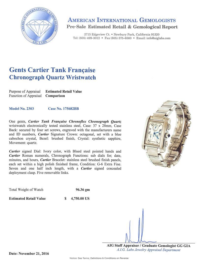 One gents, Cartier Tank Francaise Chronoflex Chronograph Quartz wristwatch electronically tested stainless steel, Case: 37 x 28mm, Case Back: secured by four set screws, engraved with the manufacturers name and ID numbers, Cartier Signature Crown: octagonal, set with a blue cabochon crystal, Bezel: brushed finish, Crystal: synthetic sapphire, Movement: quartz. Cartier signed Dial: Ivory color, with Blued steel pointed hands and Cartier Roman numerals, Chronograph Functions: sub dials for; date, minutes, and hours, Cartier Bracelet: stainless steel brushed finish panels, each set within a high polish finished frame, Condition: G-6 Extra Fine. Seven and one half inch length, with a Cartier signed concealed deployment clasp. Five removable links. Total Weight of Watch 96.36gm. AIG Appraised at $4,750.00.