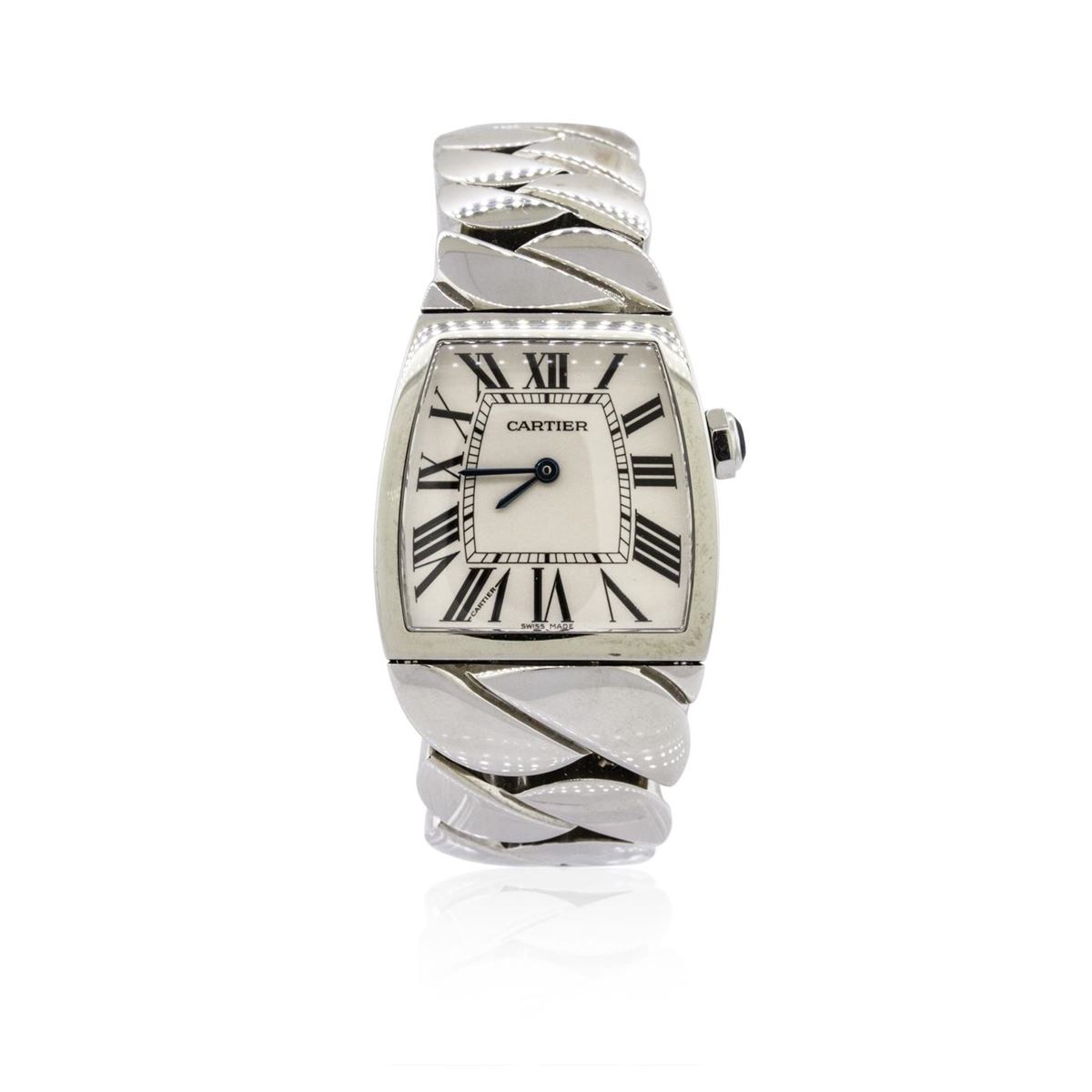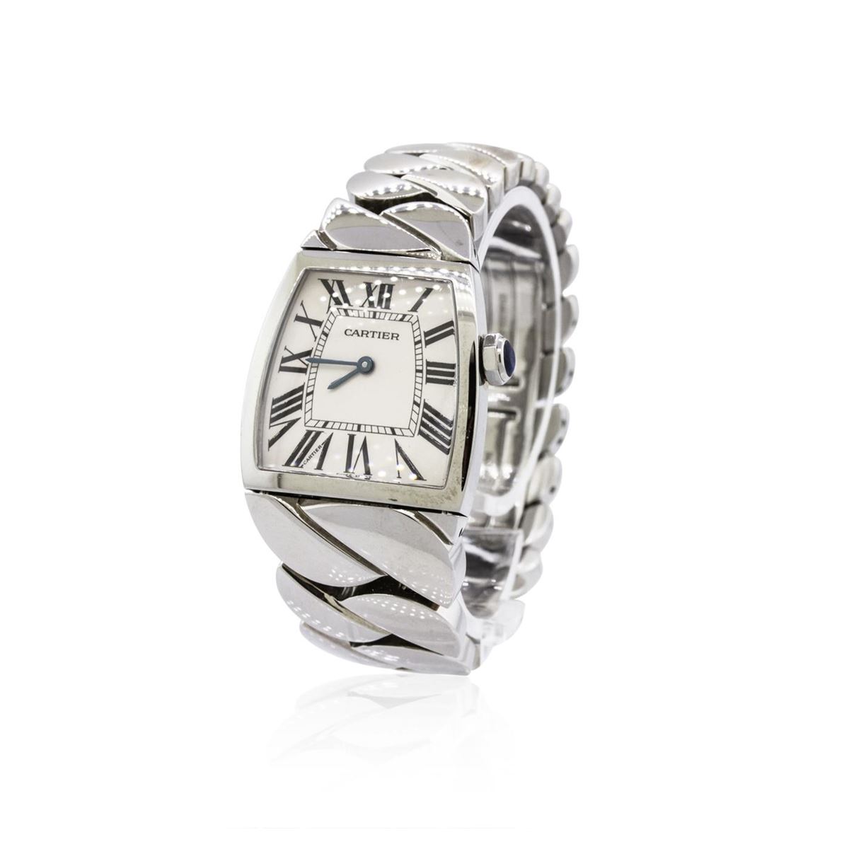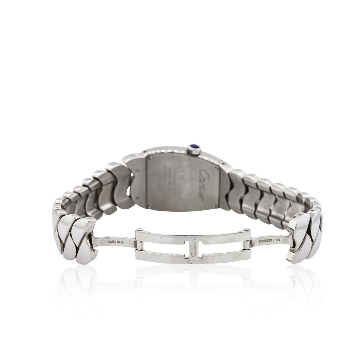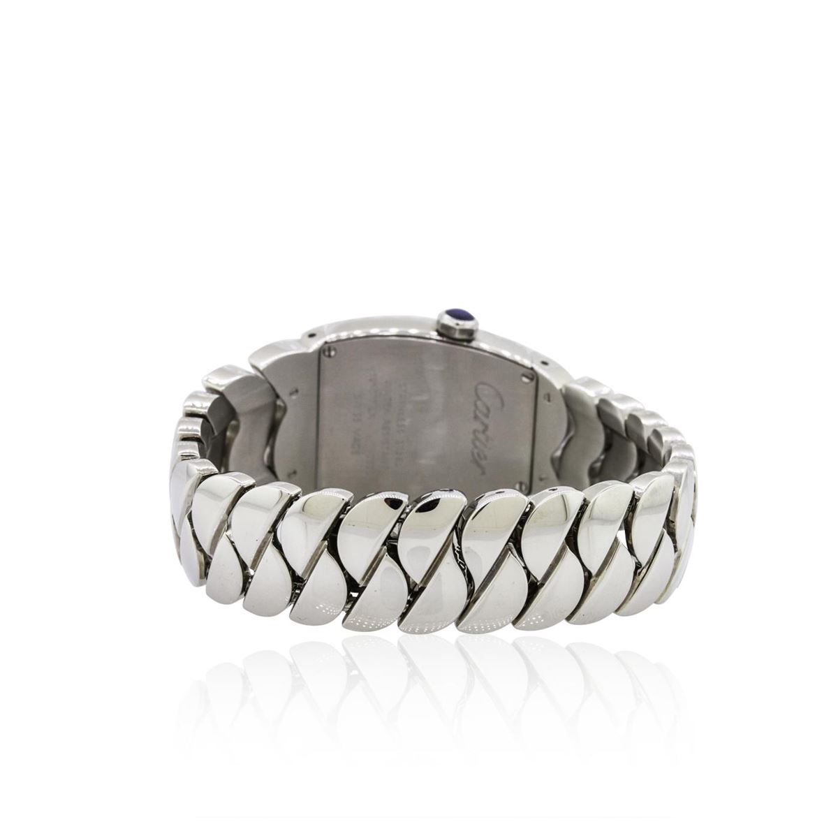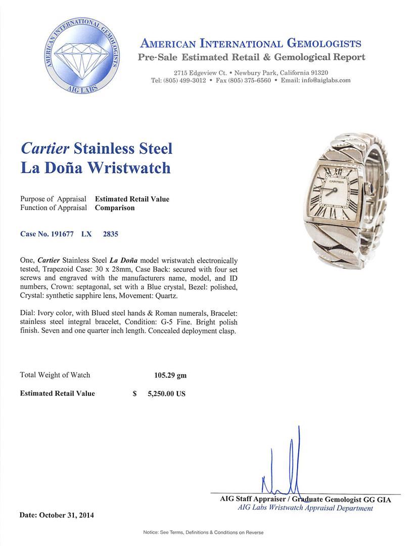 One, Cartier Stainless Steel La Doa model wristwatch electronically tested, Trapezoid Case: 30 x 28mm, Case Back: secured with four set screws and engraved with the manufacturers name, model, and ID numbers, Crown: septagonal, set with a Blue crystal, Bezel: polished, Crystal: synthetic sapphire lens, Movement: Quartz. Dial: Ivory color, with Blued steel hands & Roman numerals, Bracelet: stainless steel integral bracelet, Condition: G-5 Fine. Bright polish finish. Seven and one quarter inch length. Concealed deployment clasp. Total Weight of Watch 105.29 grams. AIG Appraised at $5,680.00.
