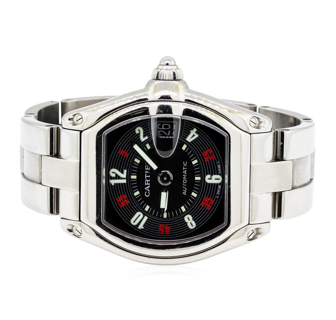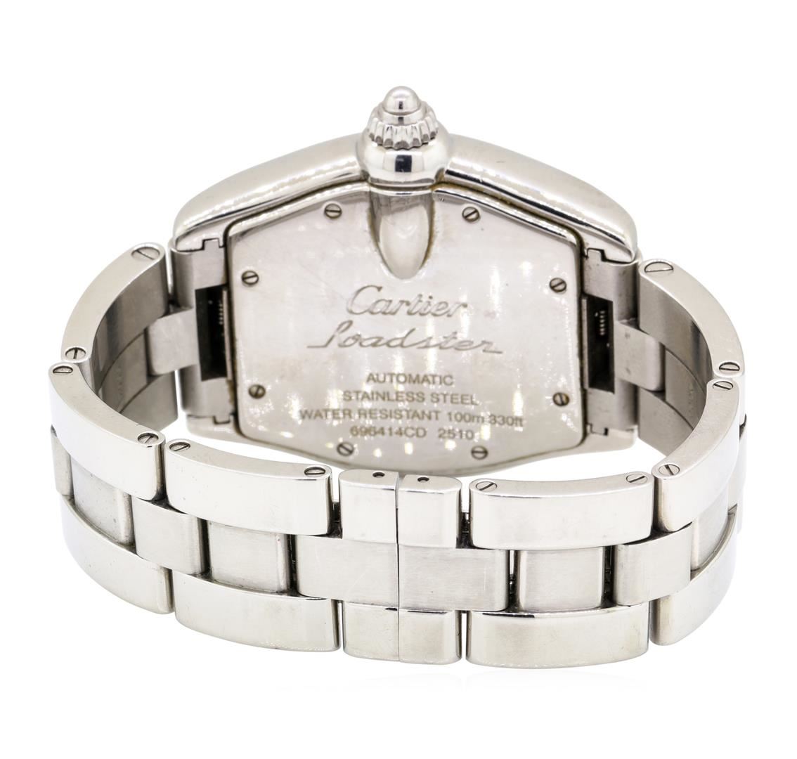 One stainless steel Cartier Roadster wristwatch with a 37mm case. The watch has a stainless steel bezel with a black dial, luminous hands and hour markers. The crystal is sapphire with a cyclops lens and date window at the 3 o'clock position. Refernce number 2510, serial number 696414CD.