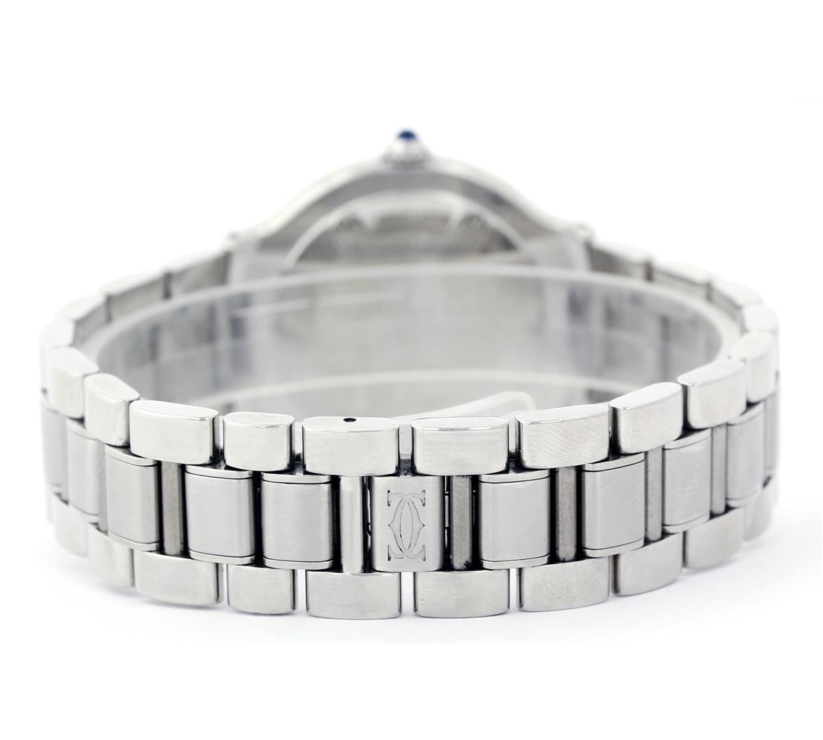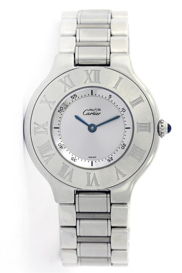One Ladies Cartier Must De 21 Stainless Steel Polished Bright with Satin Finish, Serviced & Electronically Tested, Stainless Steel Case:30mm, Sapphire Crown, Original Bezel: Stainless Steel. Crystal: Synthetic Lens. Movement: Quartz. Dial: Grey. Model: 1330 Condition: G-6 Extra Fine. Bracelet: Stainless Steel. Bright Polish & Satin Finish. 5.5 Inch Length, Adjustable. Standard Clasp.