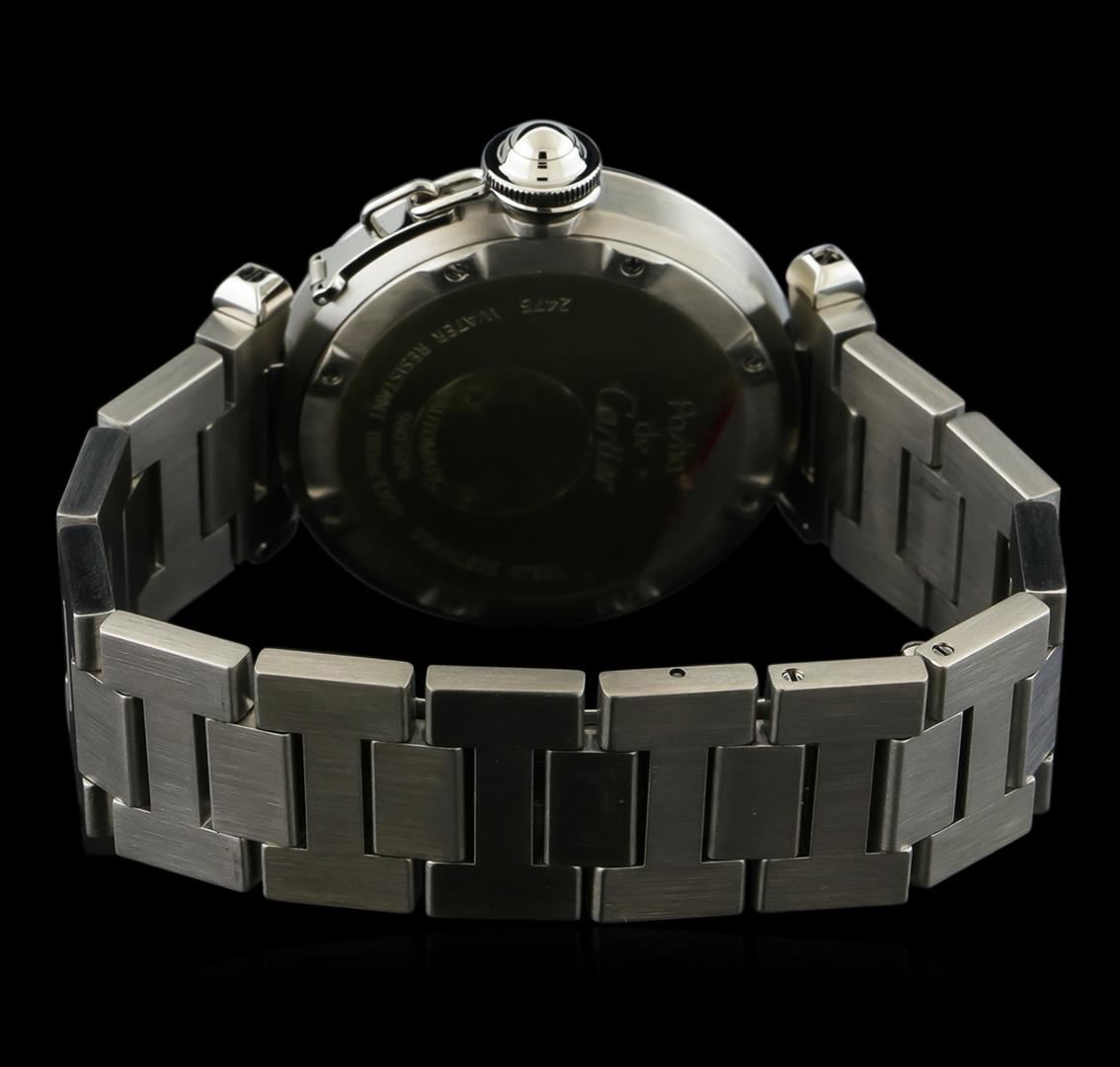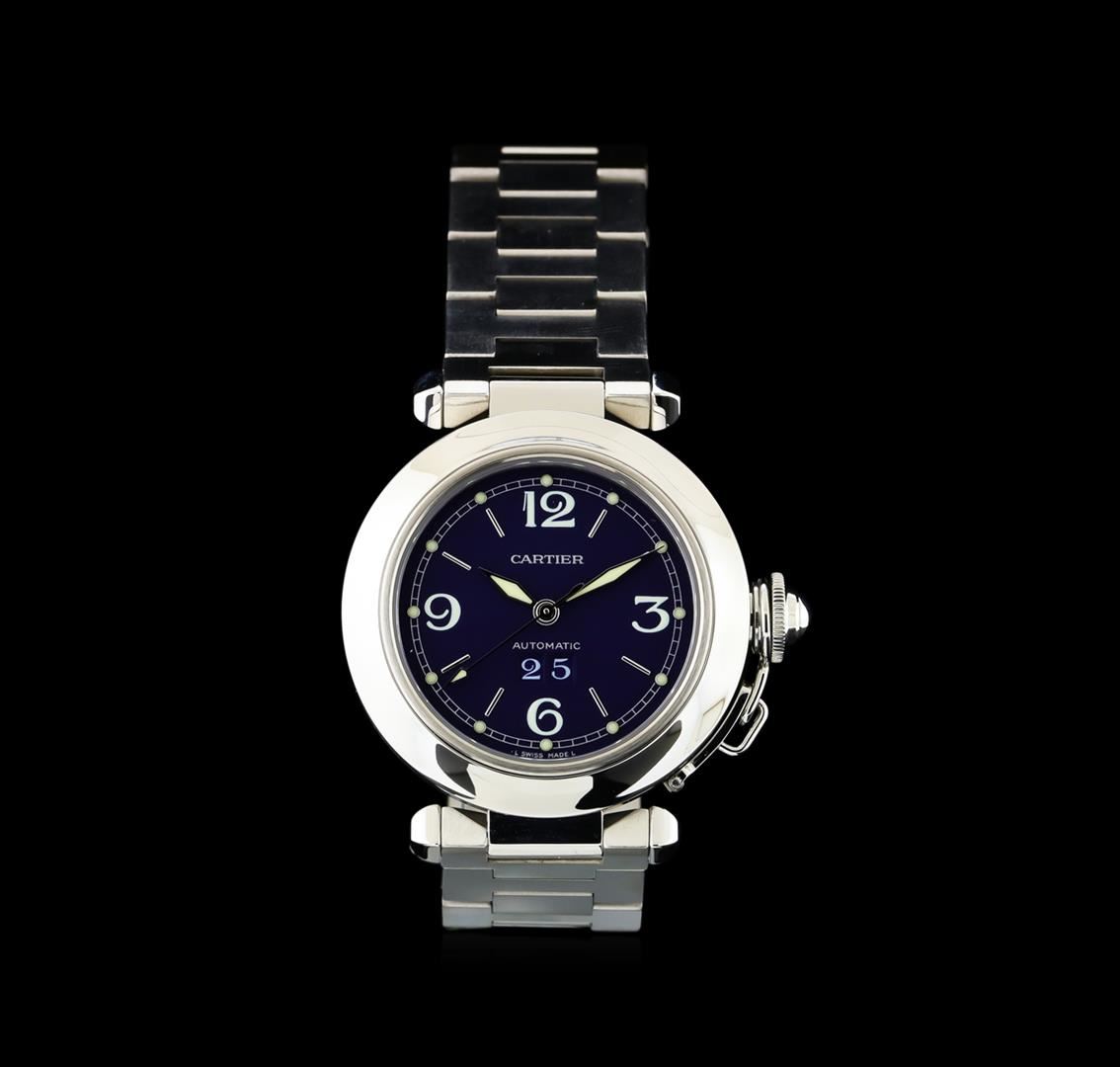 One Cartier Pasha De Cartier ladies watch. Movement: Automatic. Model: Pasha De Cartier 2475. Functions: Hours, minutes, and seconds. Case: Stainless steel. Crystal: Sapphire crystal. Bezel: Stainless steel. Dial Color: Blue. Hands: Silver-tone dauphine hands. Date Window: Located at the 6 o'clock position. Bracelet: Stainless steel link. Water Resistance: 100 meters, 330 feet.