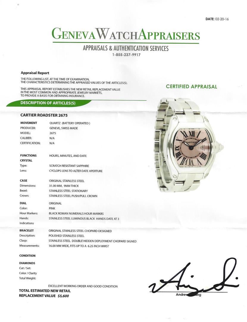 One Cartier Roadster 2675 watch. Movement: Quartz (battery operated). Producer: Geneve, Swiss made. Model: 2675. Functions: Hours, minutes, and date. Crystal: Scratch resistant sapphire. Lens: Cyclops lens to alter date aperture. Case: Original stainless steel. Case Dimensions: 31.00mm, 9mm thick. Bezel: Stainless steel stationary. Crown: Stainless steel push/pull crown. Dial: Original. Dial Color: Pink. Hands: Stainless steel luminous black hands. Date Window: Located at the 3 o'clock position. Bracelet: Original stainless steel chopard designed. Clasp: Stainless steel double hidden deployment chopard signed. Length: 16.00mm wide, fits up to a 6.25 inch wrist.