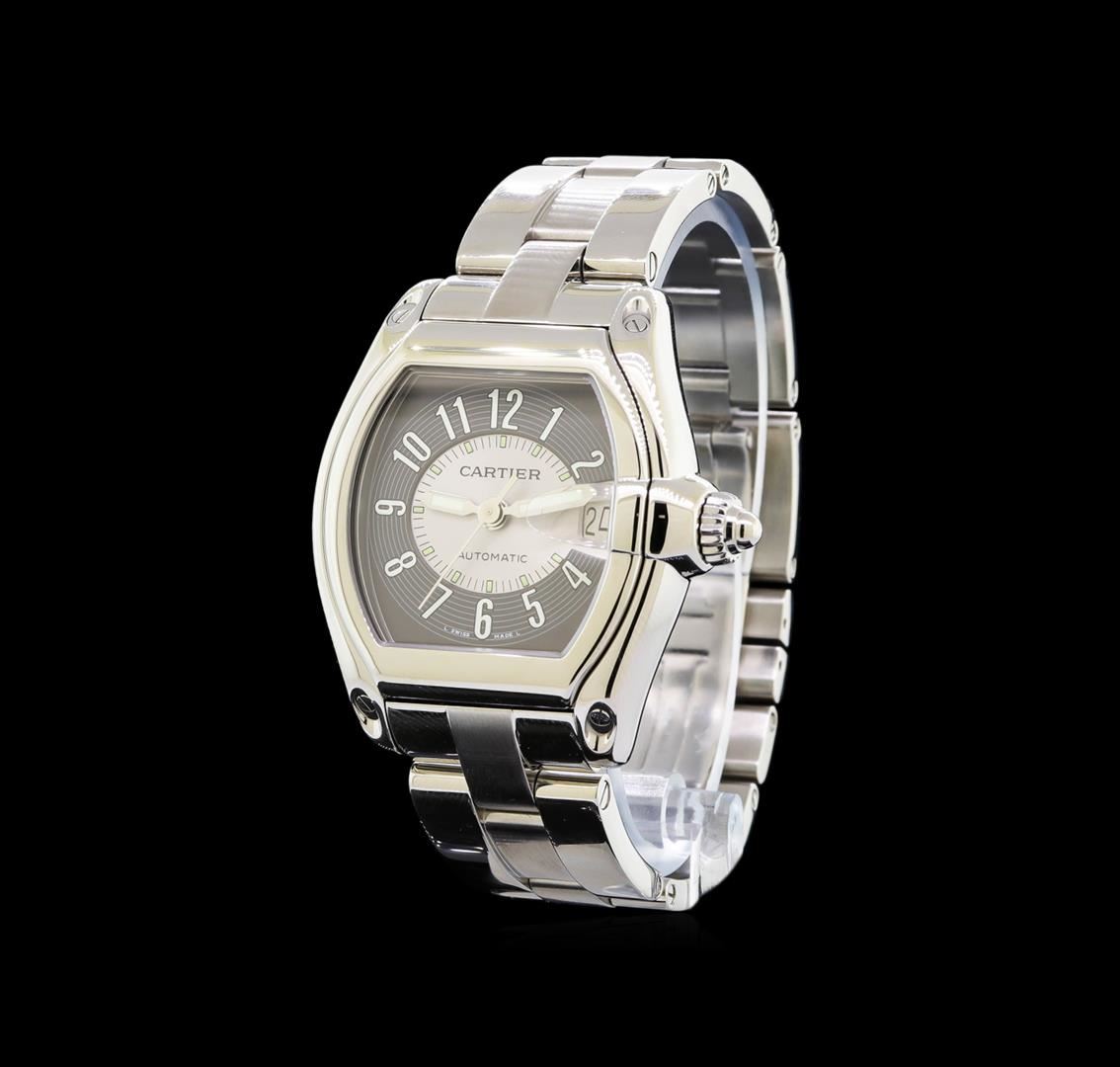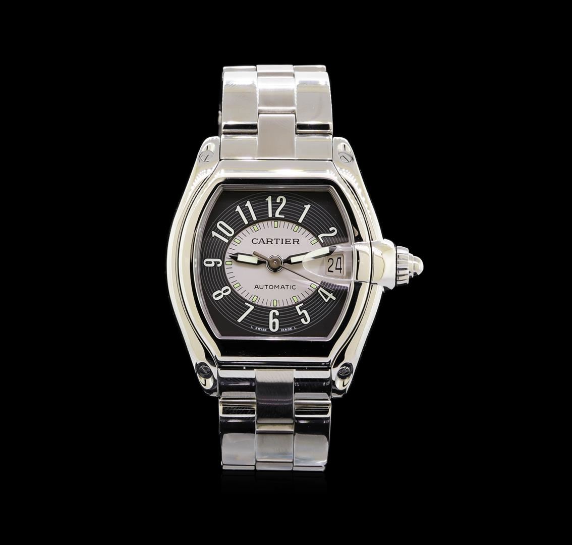 One, Cartier Stainless Steel Roadster model wristwatch electronically tested, Case: 45mm x 36mm, Case Back: secured with eight set screws and engraved with the manufacturers name, model, and ID numbers. Water Resistant: 100 meters / 330 feet, Crown: scalloped lower section, cabochon upper section, Tiered Bezel: polished, Crystal: synthetic sapphire lens, Movement: Swiss Automatic. Cartier signed Dial: Silver color center within a Black Sunray frame, with luminous hands, indices & numerals, Calendar: 3 o'clock position date window, Cartier Bracelet: stainless steel integral links, Condition: G-6 Extra Fine. Bright polish & satin finish. Seven inch length. Cartier signed concealed deployment clasp. Total Weight of Watch 137.69gm. AIG Appraised at $6,550.00.