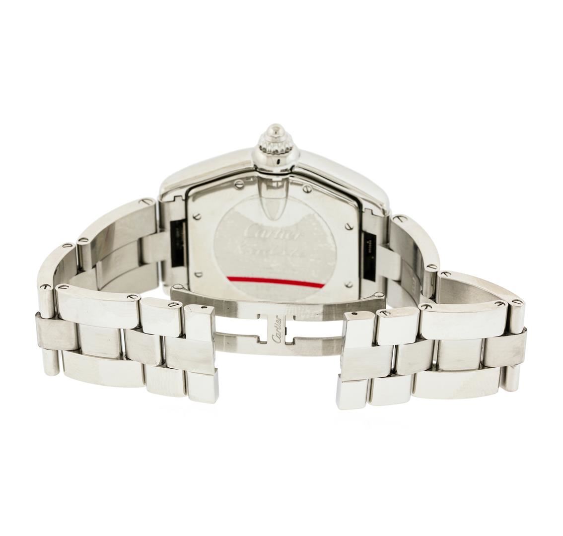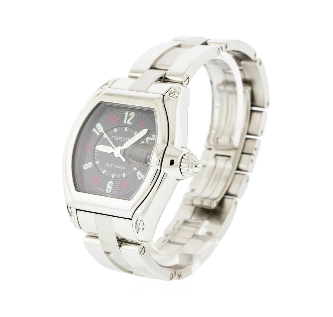 One, Cartier Stainless Steel Roadster model wristwatch electronically tested, Case: 45mm x 36mm, Case Back: secured with eight set screws and engraved with the manufacturers name, model, and ID numbers, Water Resistant: 100 meters / 330 feet, Tiered Bezel: polished, Crystal: synthetic sapphire lens, Movement: Swiss Automatic. Cartier signed Dial: Las Vegas Sun Ray pattern, with luminous hands & numerals, Calendar: 3 o'clock position date window, Cartier Bracelet: stainless steel integral bracelet, Condition: G-6 Extra Fine. Bright polish & satin finish. Seven and one quarter inch length. Cartier hallmarked concealed deployment clasp. Total Weight of Watch 138.01gm. AIG Appraised at $5,440.00.