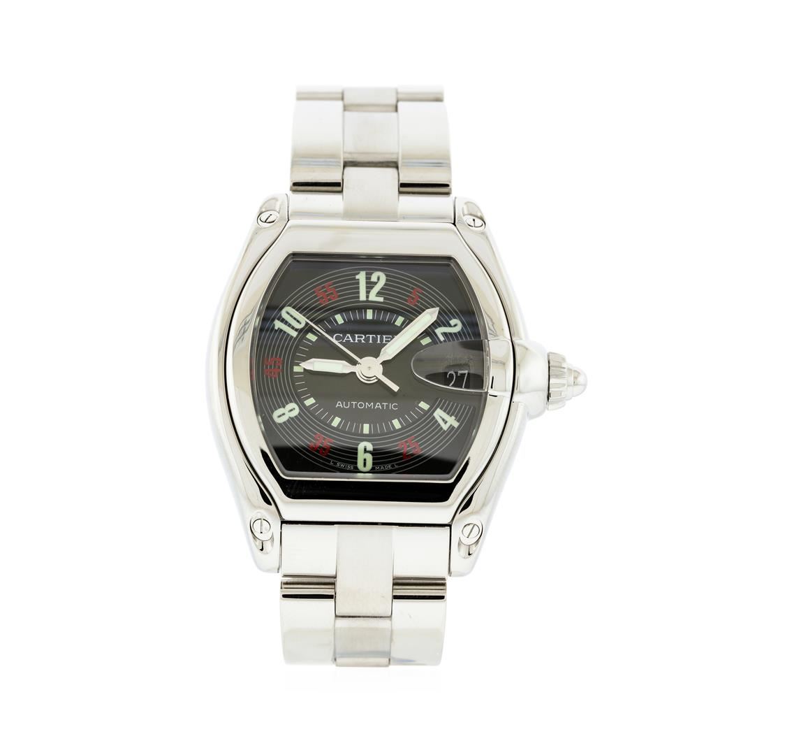 One, Cartier Stainless Steel Roadster model wristwatch electronically tested, Case: 45mm x 36mm, Case Back: secured with eight set screws and engraved with the manufacturers name, model, and ID numbers, Water Resistant: 100 meters / 330 feet, Tiered Bezel: polished, Crystal: synthetic sapphire lens, Movement: Swiss Automatic. Cartier signed Dial: Las Vegas Sun Ray pattern, with luminous hands & numerals, Calendar: 3 o'clock position date window, Cartier Bracelet: stainless steel integral bracelet, Condition: G-6 Extra Fine. Bright polish & satin finish. Seven and one quarter inch length. Cartier hallmarked concealed deployment clasp. Total Weight of Watch 138.01gm. AIG Appraised at $5,440.00.
