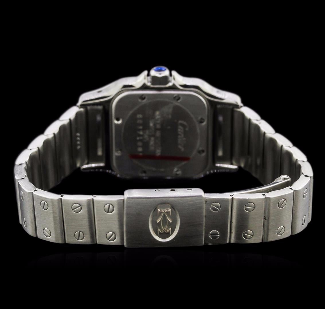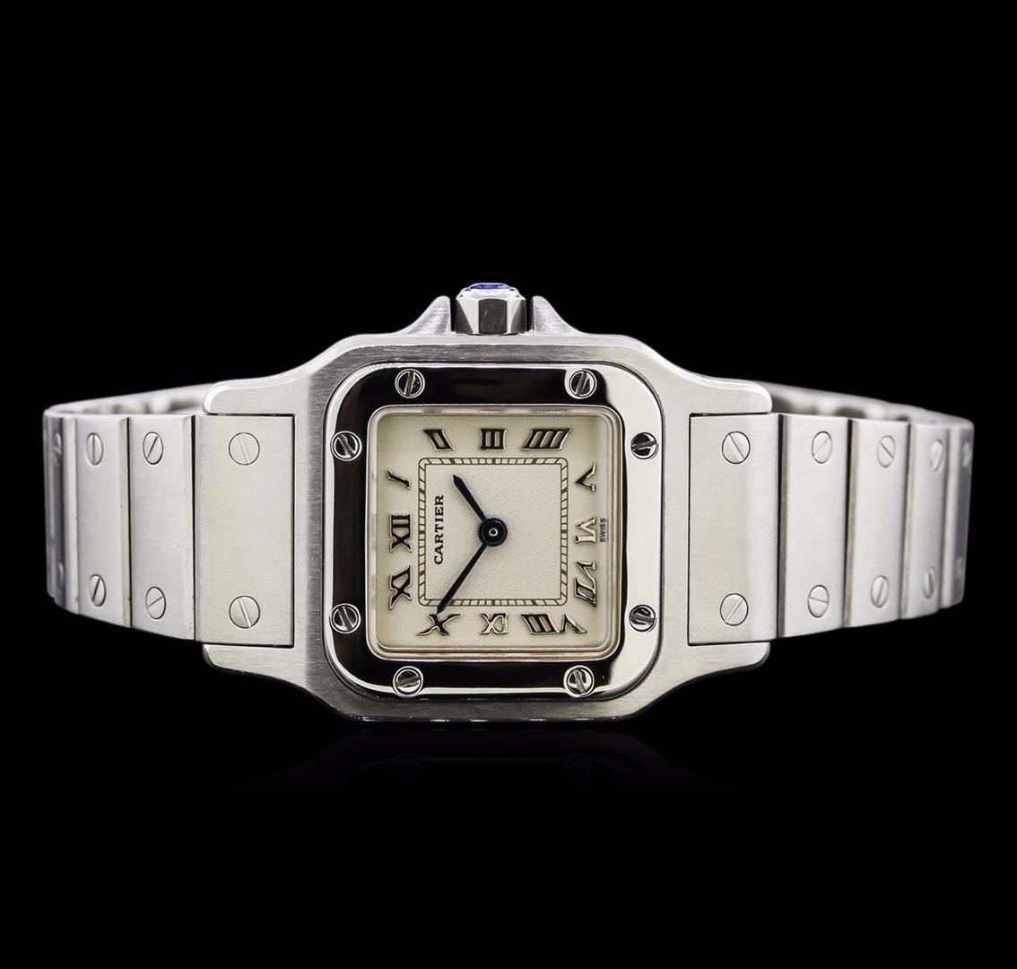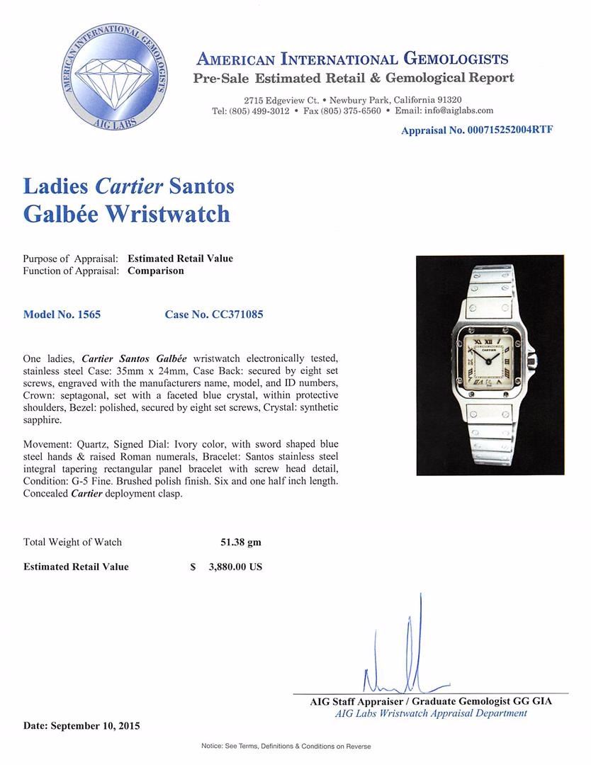 One ladies, Cartier Santos Galbee wristwatch electronically tested, stainless steel Case: 35mm x 24mm, Case Back: secured by eight set screws, engraved with the manufacturers name, model, and ID numbers, Crown: septagonal, set with a faceted blue crystal, within protective shoulders, Bezel: polished, secured by eight set screws, Crystal: synthetic sapphire. Movement: Quartz, Signed Dial: Ivory color, with sword shaped blue steel hands & raised Roman numerals, Bracelet: Santos stainless steel integral tapering rectangular panel bracelet with screw head detail, Condition: G-5 Fine. Brushed polish finish. Six and one half inch length. Concealed Cartier deployment clasp. Total Weight of Watch 51.38gm. AIG Appraised at $3,880.00.