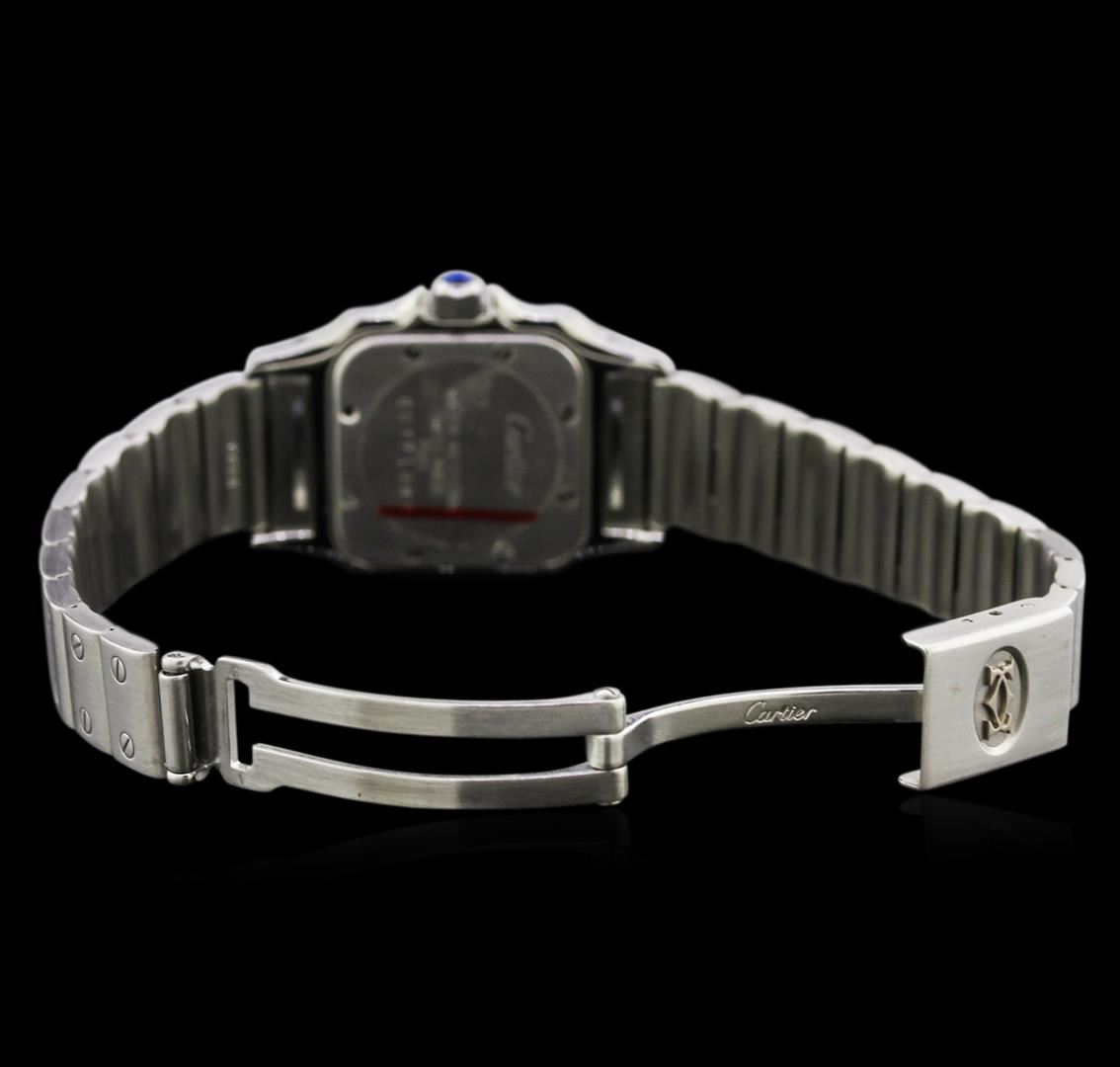 One ladies, Cartier Santos Galbee wristwatch electronically tested, stainless steel Case: 35mm x 24mm, Case Back: secured by eight set screws, engraved with the manufacturers name, model, and ID numbers, Crown: septagonal, set with a faceted blue crystal, within protective shoulders, Bezel: polished, secured by eight set screws, Crystal: synthetic sapphire. Movement: Quartz, Signed Dial: Ivory color, with sword shaped blue steel hands & raised Roman numerals, Bracelet: Santos stainless steel integral tapering rectangular panel bracelet with screw head detail, Condition: G-5 Fine. Brushed polish finish. Six and one half inch length. Concealed Cartier deployment clasp. Total Weight of Watch 51.38gm. AIG Appraised at $3,880.00.