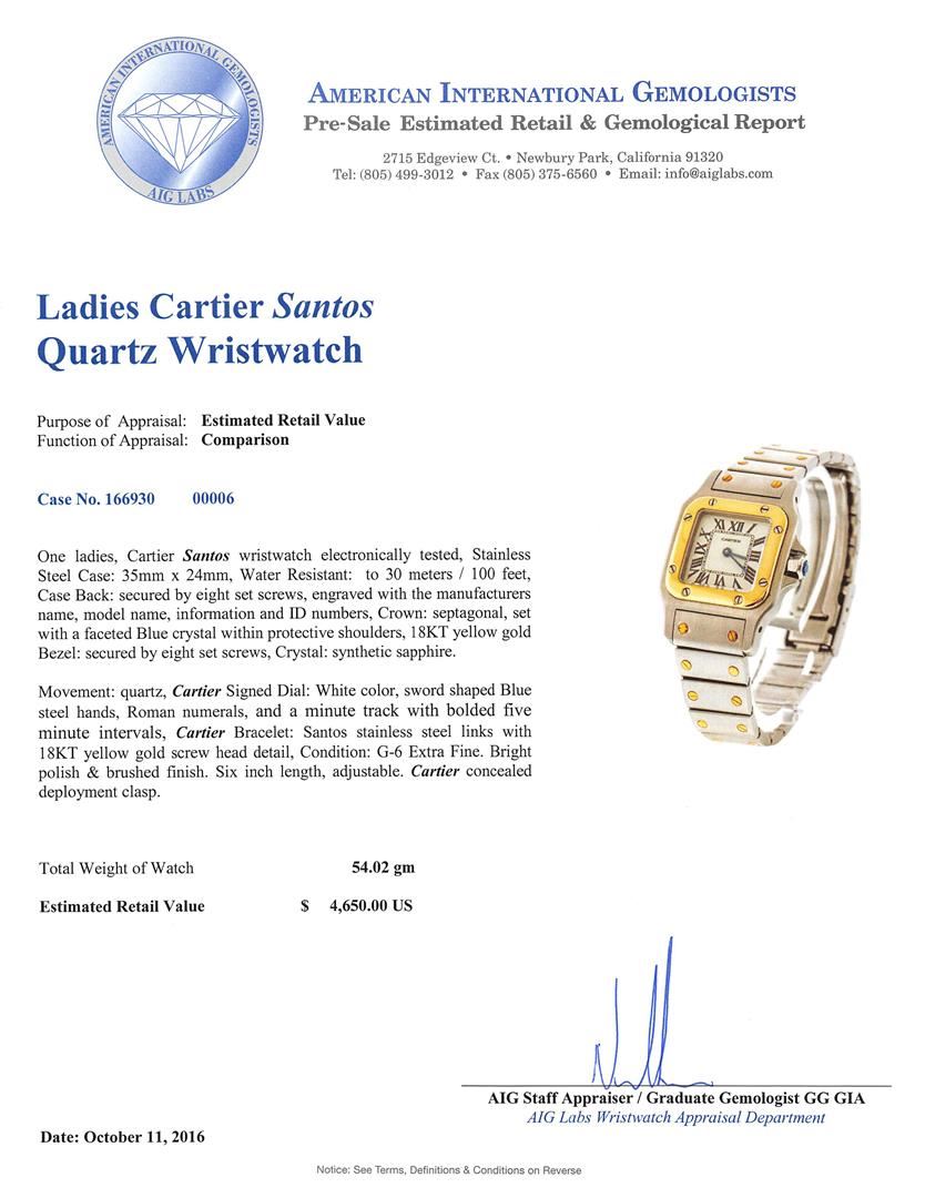 One ladies, Cartier Santos wristwatch electronically tested, Stainless Steel Case: 35mm x 24mm, Water Resistant: to 30 meters / 100 feet, Case Back: secured by eight set screws, engraved with the manufacturers name, model name, information and ID numbers, Crown: septagonal, set with a faceted Blue crystal within protective shoulders, 18KT yellow gold Bezel: secured by eight set screws, Crystal: synthetic sapphire. Movement: quartz, Cartier Signed Dial: White color, sword shaped Blue steel hands, Roman numerals, and a minute track with bolded five minute intervals, Cartier Bracelet: Santos stainless steel links with 18KT yellow gold screw head detail, Condition: G-6 Extra Fine. Bright polish & brushed finish. Six inch length, adjustable. Cartier concealed deployment clasp. Total Weight of Watch 54.02gm. AIG Appraised at $4,650.00.