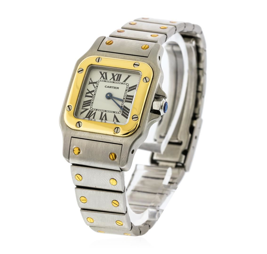 One ladies, Cartier Santos wristwatch electronically tested, Stainless Steel Case: 35mm x 24mm, Water Resistant: to 30 meters / 100 feet, Case Back: secured by eight set screws, engraved with the manufacturers name, model name, information and ID numbers, Crown: septagonal, set with a faceted Blue crystal within protective shoulders, 18KT yellow gold Bezel: secured by eight set screws, Crystal: synthetic sapphire. Movement: quartz, Cartier Signed Dial: White color, sword shaped Blue steel hands, Roman numerals, and a minute track with bolded five minute intervals, Cartier Bracelet: Santos stainless steel links with 18KT yellow gold screw head detail, Condition: G-6 Extra Fine. Bright polish & brushed finish. Six inch length, adjustable. Cartier concealed deployment clasp. Total Weight of Watch 54.02gm. AIG Appraised at $4,650.00.