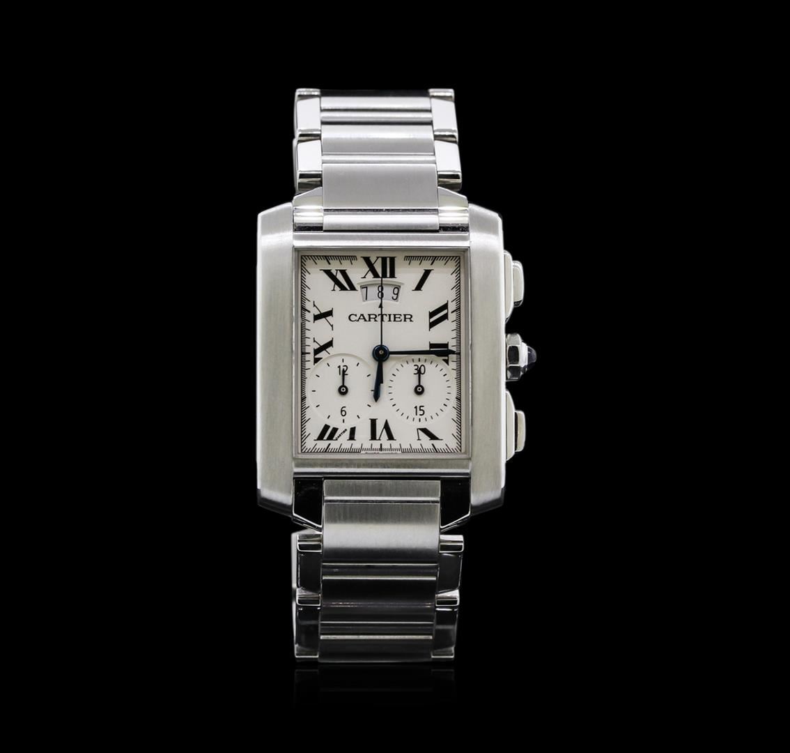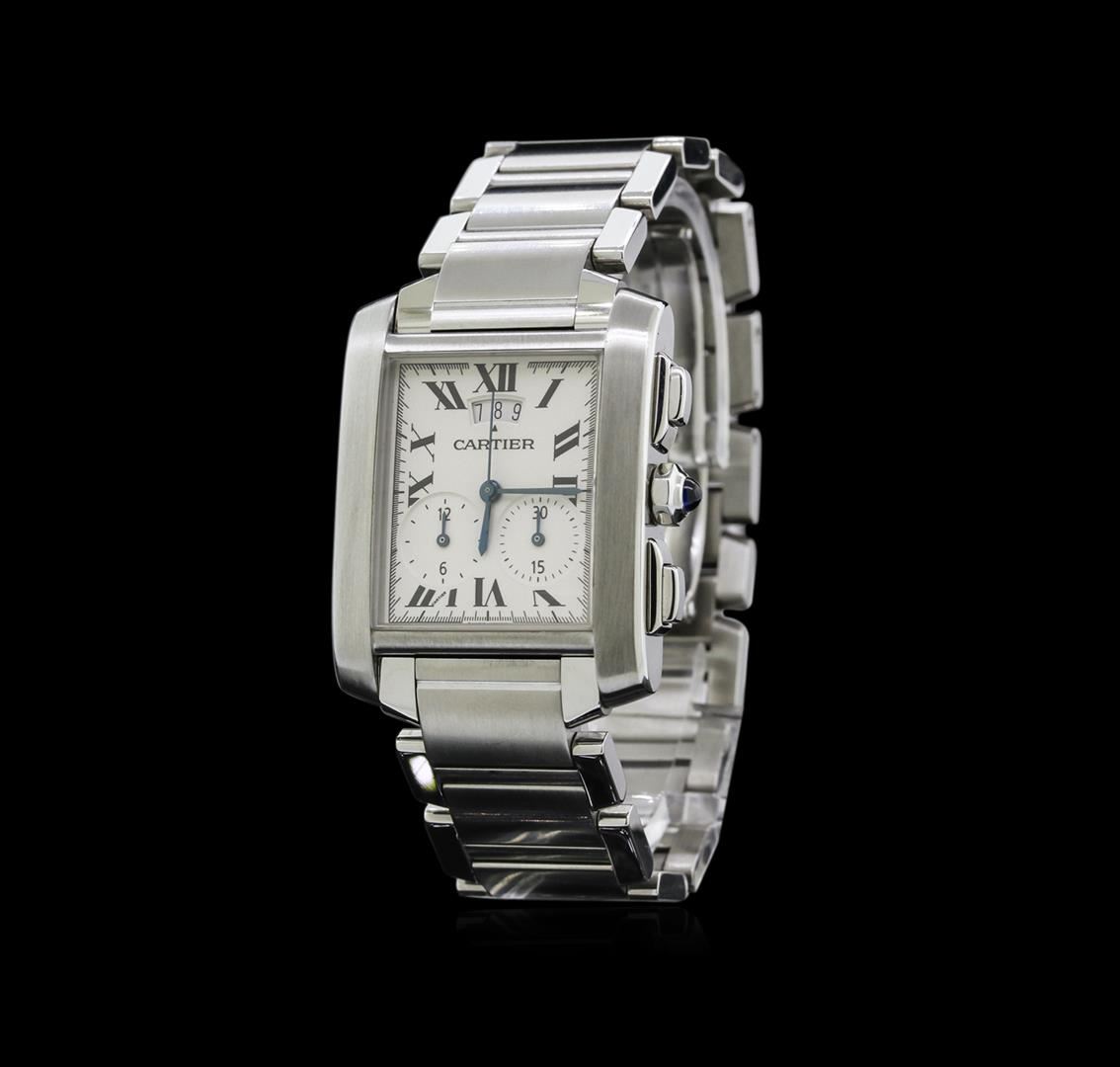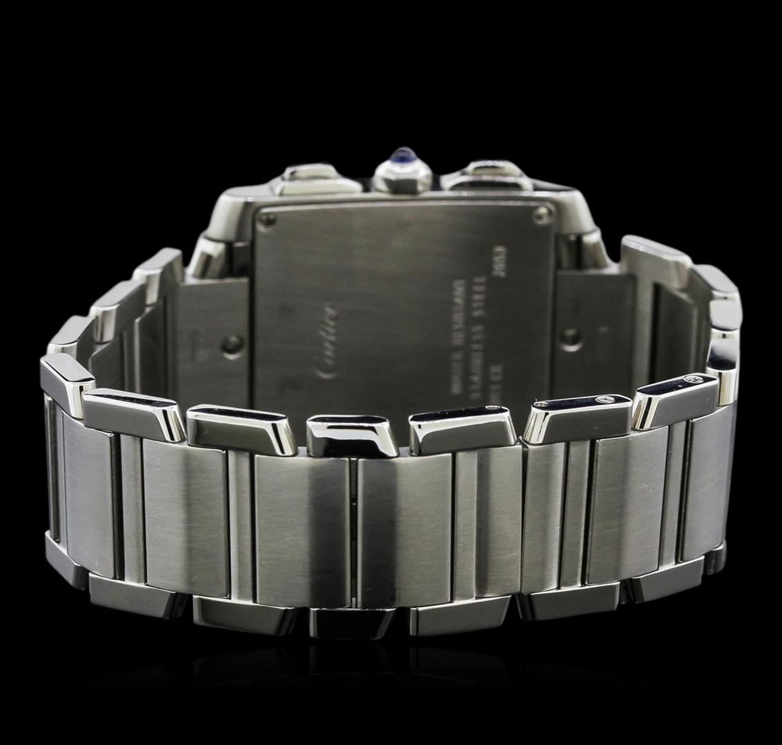 One Cartier Stainless Steel Tank Francaise Chronoflex Men's Watch featuring: Case: Stainless steel. Scratch resistant sapphire crystal. Dial: Silver grained, black Roman numeral hour markers, chronograph subdials at 4 and 8 o'clock position, date display at 12 o'clock position, blue steel sword hands, octagonal crown set with a blue sapphire cabochon. Bracelet: Stainless steel.