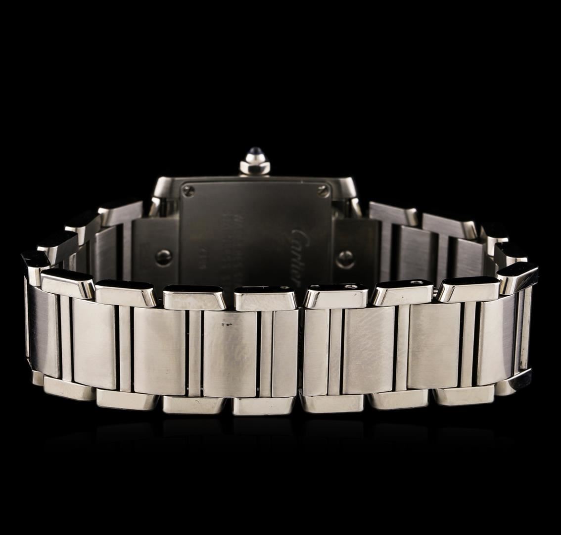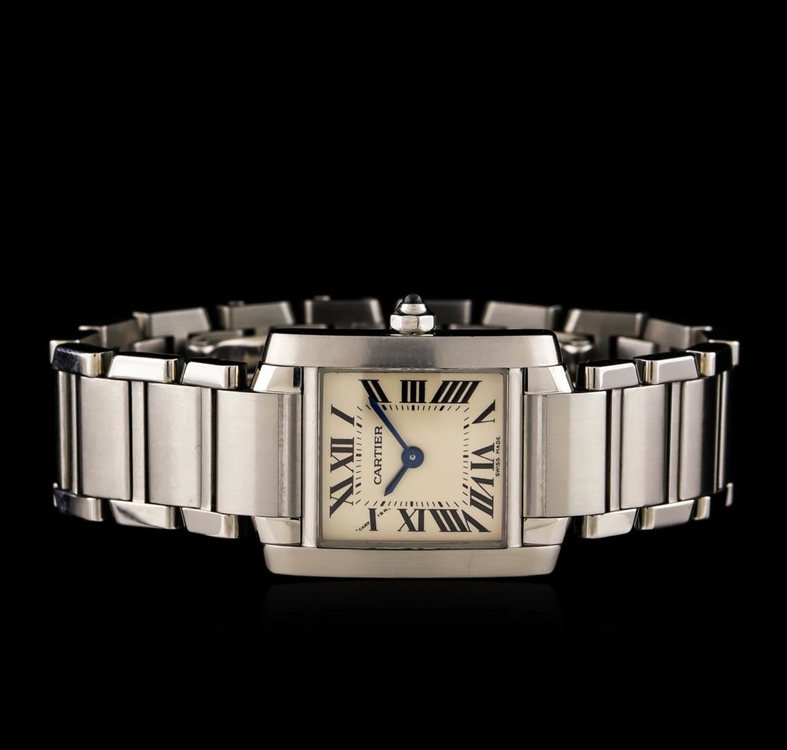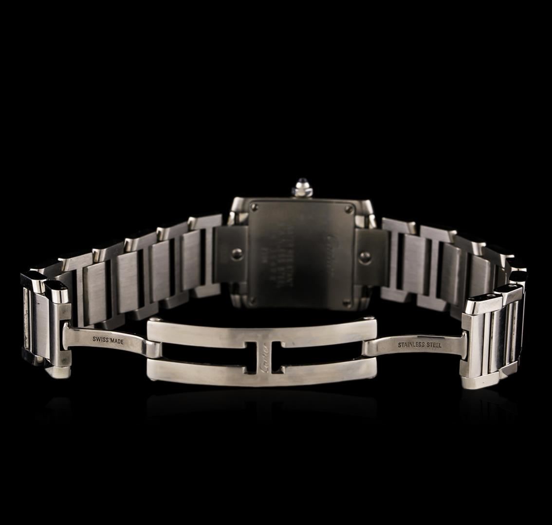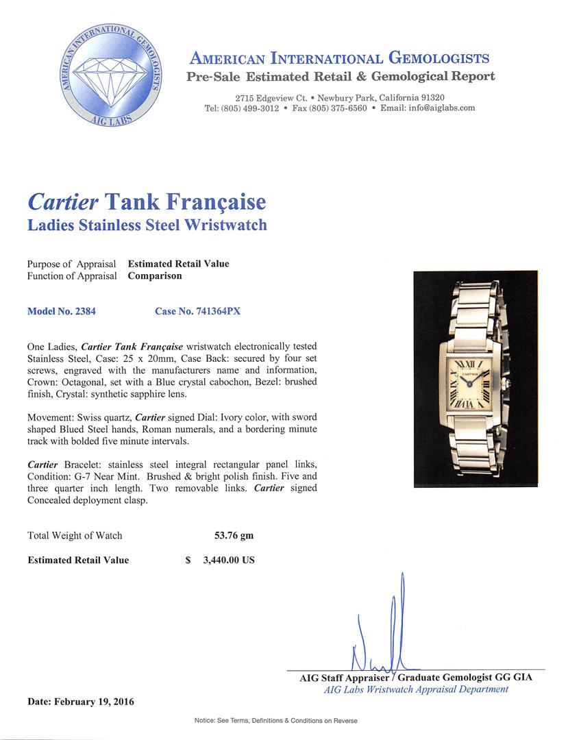 One Ladies, Cartier Tank Francaise wristwatch electronically tested Stainless Steel, Case: 25 x 20mm, Case Back: secured by four set screws, engraved with the manufacturers name and information, Crown: Octagonal, set with a Blue crystal cabochon, Bezel: brushed finish, Crystal: synthetic sapphire lens. Movement: Swiss quartz, Cartier signed Dial: Ivory color, with sword shaped Blued Steel hands, Roman numerals, and a bordering minute track with bolded five minute intervals. Cartier Bracelet: stainless steel integral rectangular panel links, Condition: G-7 Near Mint. Brushed & bright polish finish. Five and three quarter inch length. Two removable links. Cartier signed Concealed deployment clasp. Total Weight of Watch 53.76gm. AIG Appraised at $3,440.00.