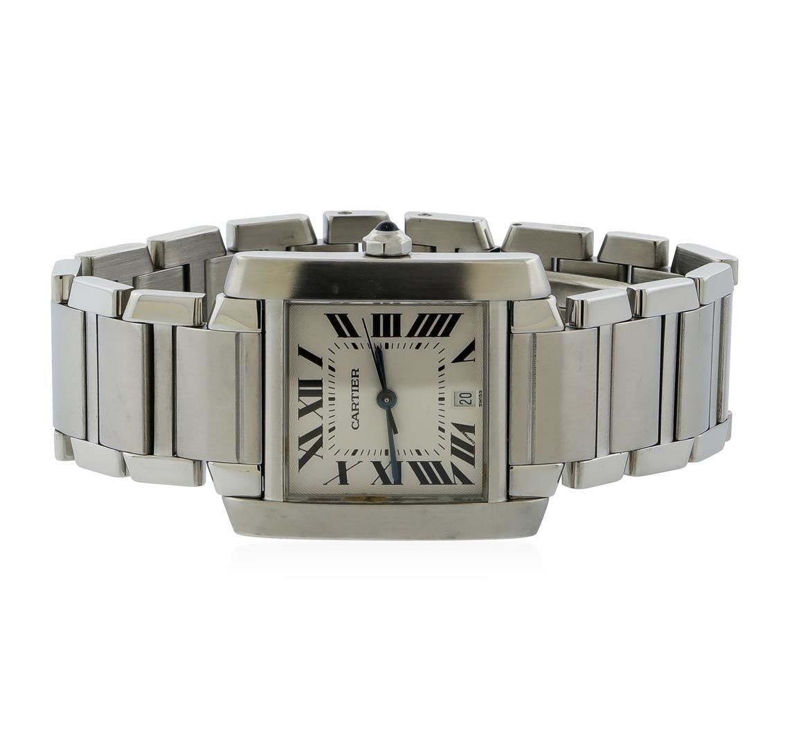 One gents, Cartier Tank Francaise wristwatch electronically tested stainless steel, Case: 32 x 28mm, Water Resistant: 30 meters / 100 feet, Case Back: secured by four set screws, engraved with the manufacturers name, information, and ID numbers, Crown: octagonal, set with a blue cabochon crystal, Bezel: brushed finish, Crystal: synthetic sapphire, Movement: Automatic. Cartier signed Dial: textured Light Ivory color, with Blue steel pointed hands and Roman numerals, Date Window: 6 o'clock position, Cartier Bracelet: stainless steel brushed finish panels, each within a bright polish frame, Condition: G-6 Extra Fine. Six and one half inch length, completed by a Cartier concealed deployment clasp. Two removable links. Total Weight of Watch 90.00gm. AIG Appraised at $4,050.00.