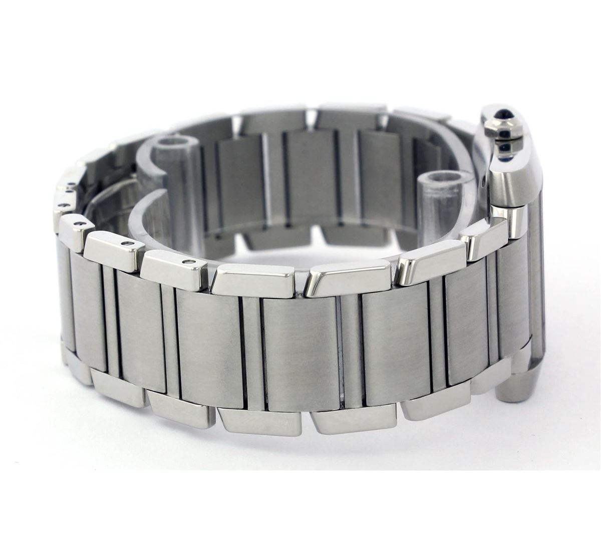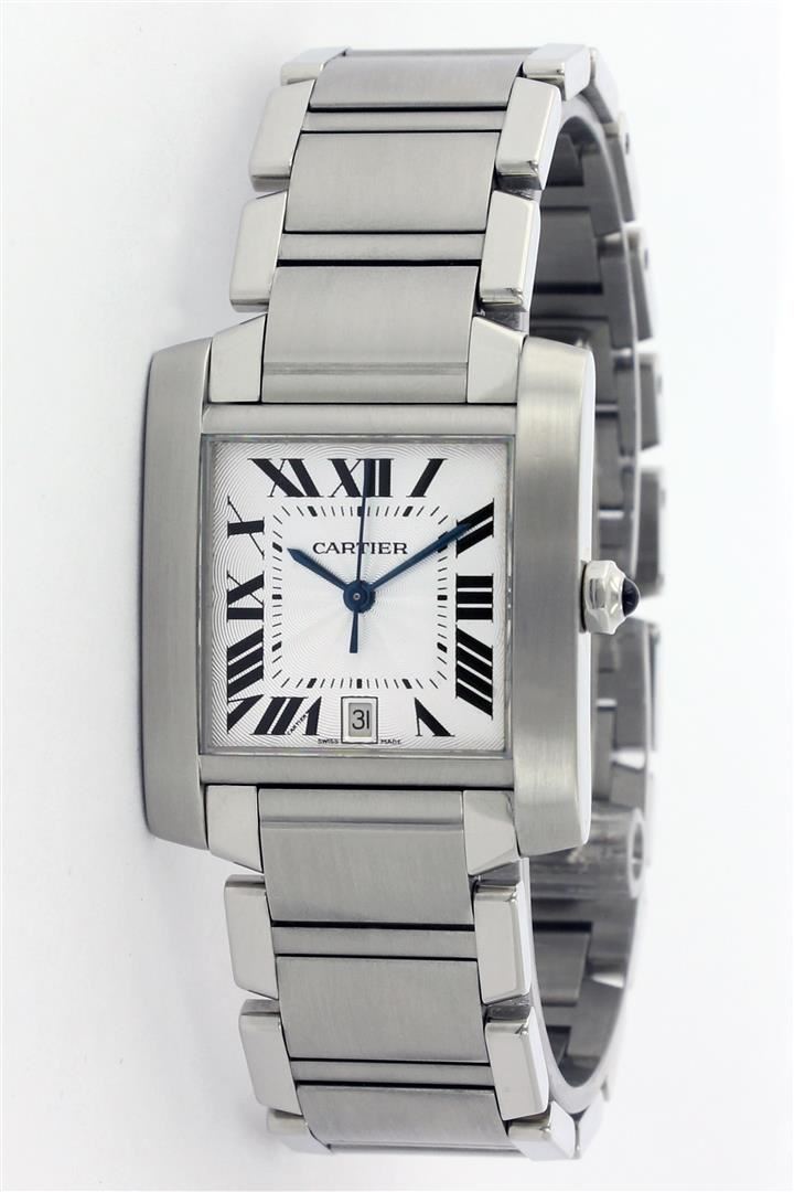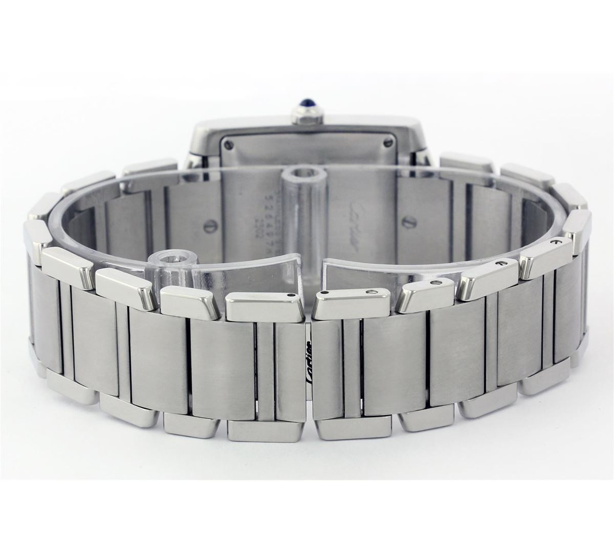 One Unisex Stainless Cartier Tank Francaise, Serviced & Electronically Tested, Case:29mm, Stainless Steel Crown, Bezel: Stainless Steel Bezel, Crystal: Sapphire Lens. Movement: Automatic 2302 Movement. Dial: White Dial With Roman Hour Markers, Date: 6 O'Clock Position. Model#2302 Condition: G-6 Extra Fine. Bracelet: Stainless Steel 5.5 Inch Length, Adjustable. Standard Clasp. This watch is in Mint condition includes original box.