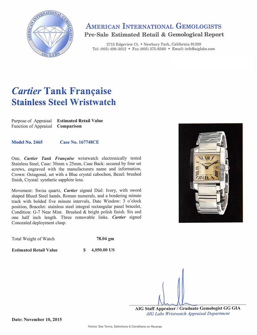 One, Cartier Tank Francaise wristwatch electronically tested Stainless Steel, Case: 30mm x 25mm, Case Back: secured by four set screws, engraved with the manufacturers name and information, Crown: Octagonal, set with a Blue crystal cabochon, Bezel: brushed finish, Crystal: synthetic sapphire lens. Movement: Swiss quartz, Cartier signed Dial: Ivory, with sword shaped Blued Steel hands, Roman numerals, and a bordering minute track with bolded five minute intervals, Bracelet: stainless steel integral rectangular panel bracelet, Condition: G-7 Near Mint. Brushed & bright polish finish. Six and one half inch length. Three removable links. Cartier signed Concealed deployment clasp. Total Weight of Watch 78.04gm. AIG Appraised at $4,050.00.