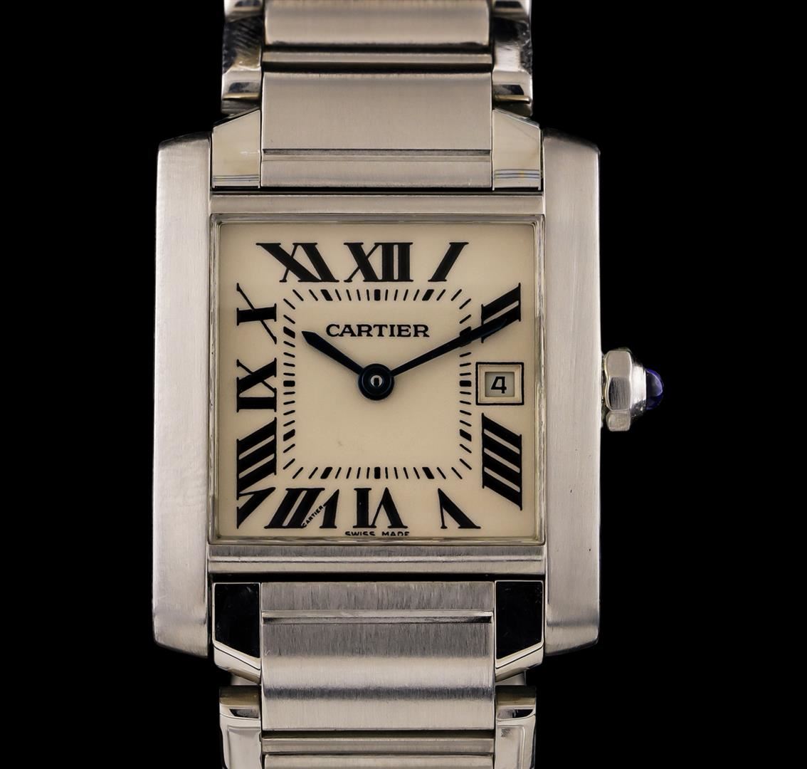 One, Cartier Tank Francaise wristwatch electronically tested Stainless Steel, Case: 30 x 25mm, Case Back: secured by four set screws, engraved with the manufacturers name and information, Crown: Octagonal, set with a Blue crystal cabochon, Bezel: brushed finish, Crystal: synthetic sapphire lens. Movement: Swiss quartz, Cartier signed Dial: Ivory color, with sword shaped Blued Steel hands, Roman numerals, and a bordering minute track with bolded five minute intervals, Date Window: 3 o'clock position. Cartier Bracelet: stainless steel integral rectangular panel links, Condition: G-7 Near Mint. Brushed & bright polish finish. Six and one quarter inch length. Two removable links. Cartier signed Concealed deployment clasp. Total Weight of Watch 74.88gm. AIG Appraised at $3,880.00.
