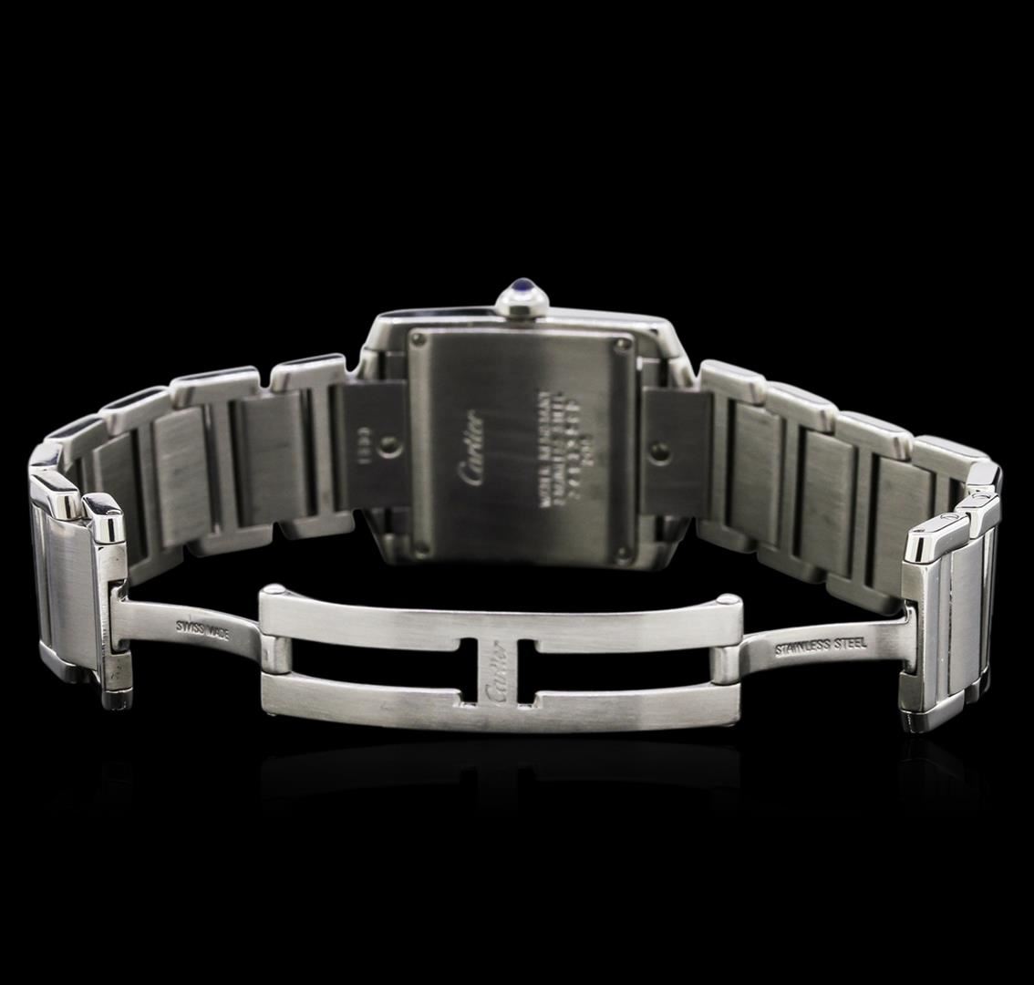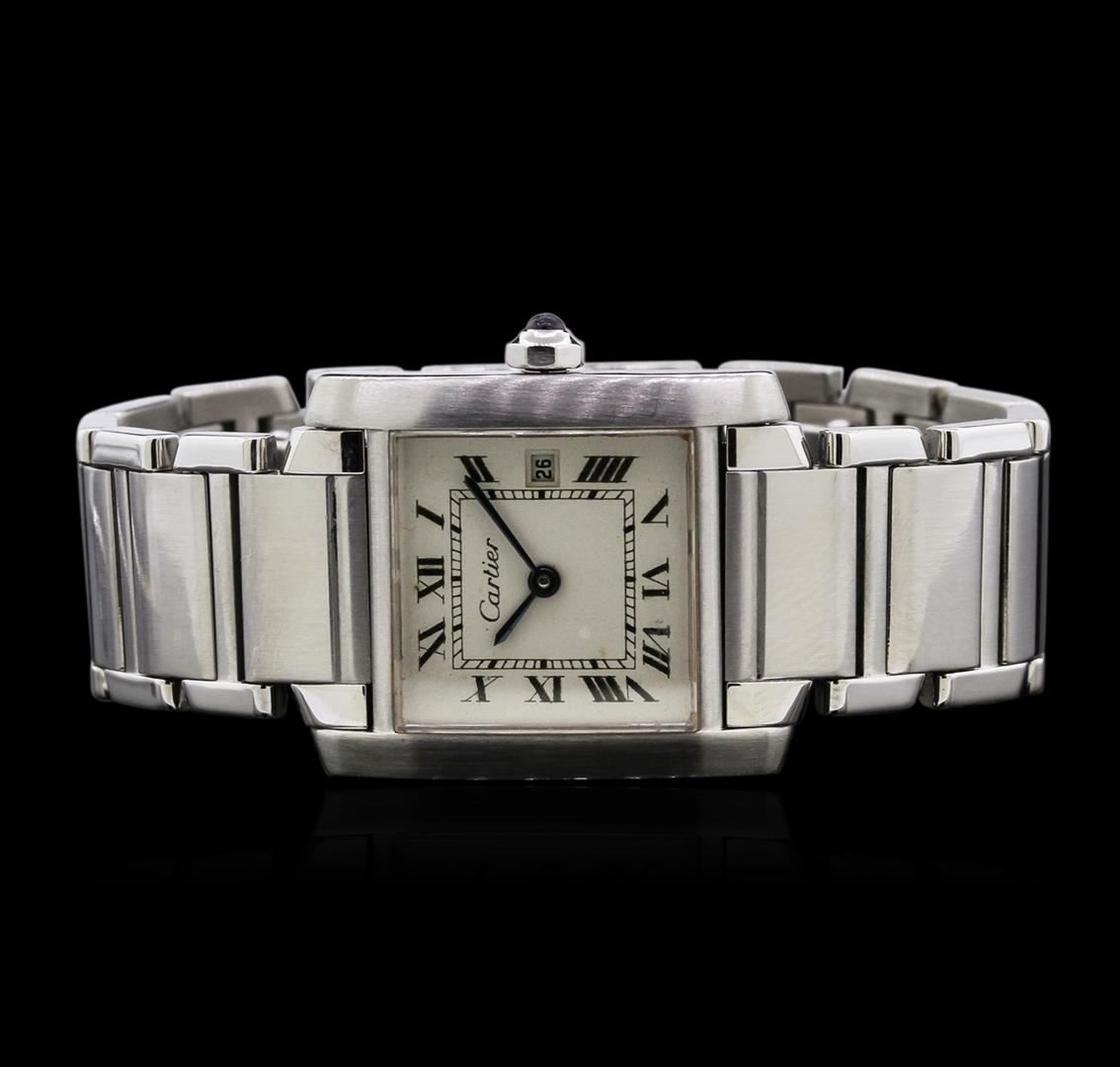 One, Cartier Tank Francaise wristwatch electronically tested Stainless Steel, Case: 30mm x 25mm, Case Back: secured by four set screws, engraved with the manufacturers name and information, Crown: Octagonal, set with a Blue crystal cabochon, Bezel: brushed finish, Crystal: synthetic sapphire lens. Movement: Swiss quartz, Cartier signed Dial: Light Ivory color, with sword shaped Blued Steel hands, Black Roman numerals, and a bordering minute track with bolded five minute intervals, Date Window: 3 o'clock position, Bracelet: stainless steel integral rectangular panel bracelet, Condition: G-7 Near Mint. Brushed & bright polish finish. Six and one quarter inch length. Two removable links. Cartier signed Concealed deployment clasp. Total Weight of Watch 74.49gm. AIG Appraised at $4,050.00.