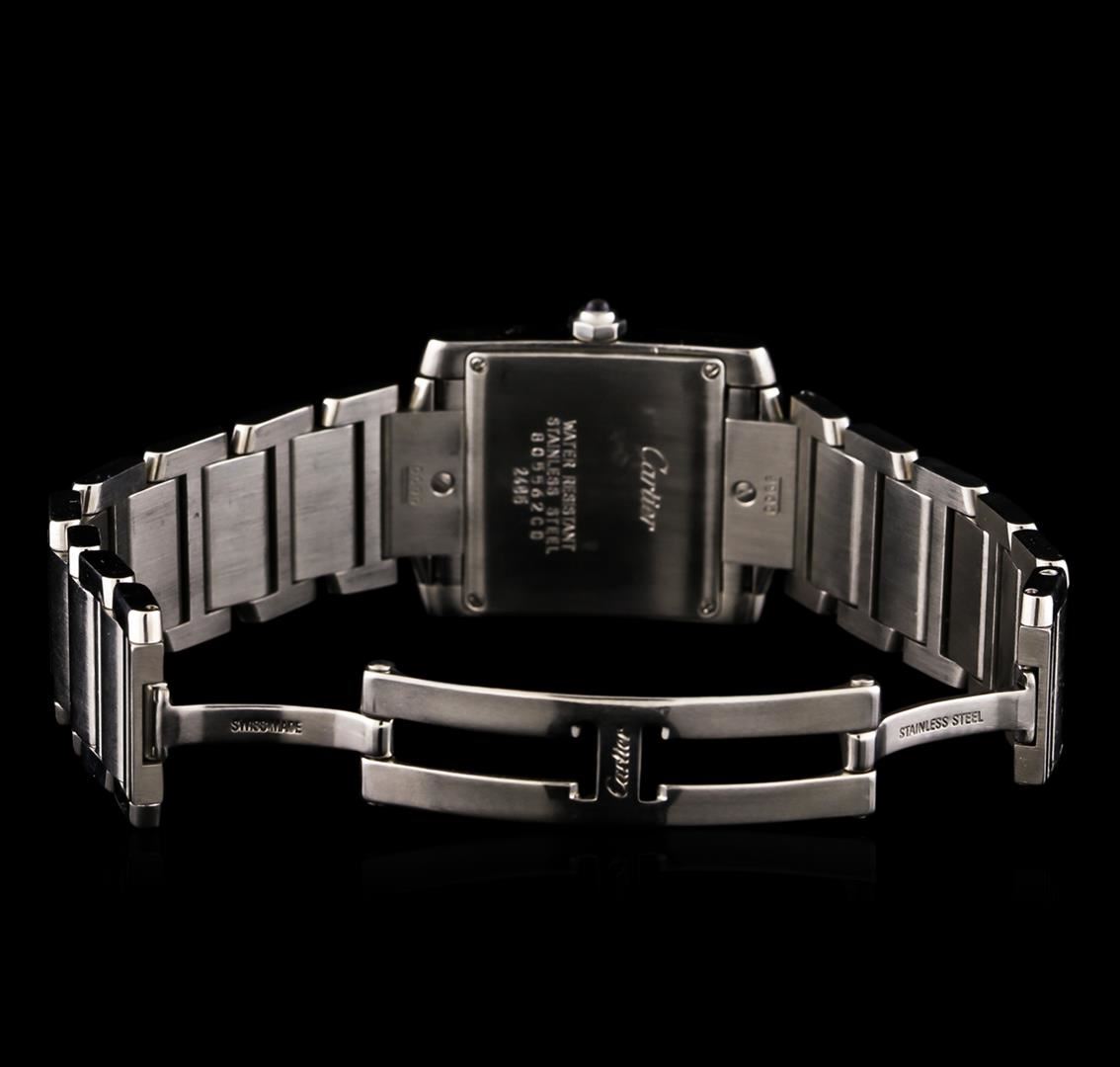 One, Cartier Tank Francaise wristwatch electronically tested Stainless Steel, Case: 30 x 25mm, Case Back: secured by four set screws, engraved with the manufacturers name and information, Crown: Octagonal, set with a Blue crystal cabochon, Bezel: brushed finish, Crystal: synthetic sapphire lens. Movement: Swiss quartz, Cartier signed Dial: Ivory color, with sword shaped Blued Steel hands, Roman numerals, and a bordering minute track with bolded five minute intervals, Date Window: 3 o'clock position. Cartier Bracelet: stainless steel integral rectangular panel links, Condition: G-7 Near Mint. Brushed & bright polish finish. Six and one quarter inch length. Two removable links. Cartier signed Concealed deployment clasp. Total Weight of Watch 74.88gm. AIG Appraised at $3,880.00.
